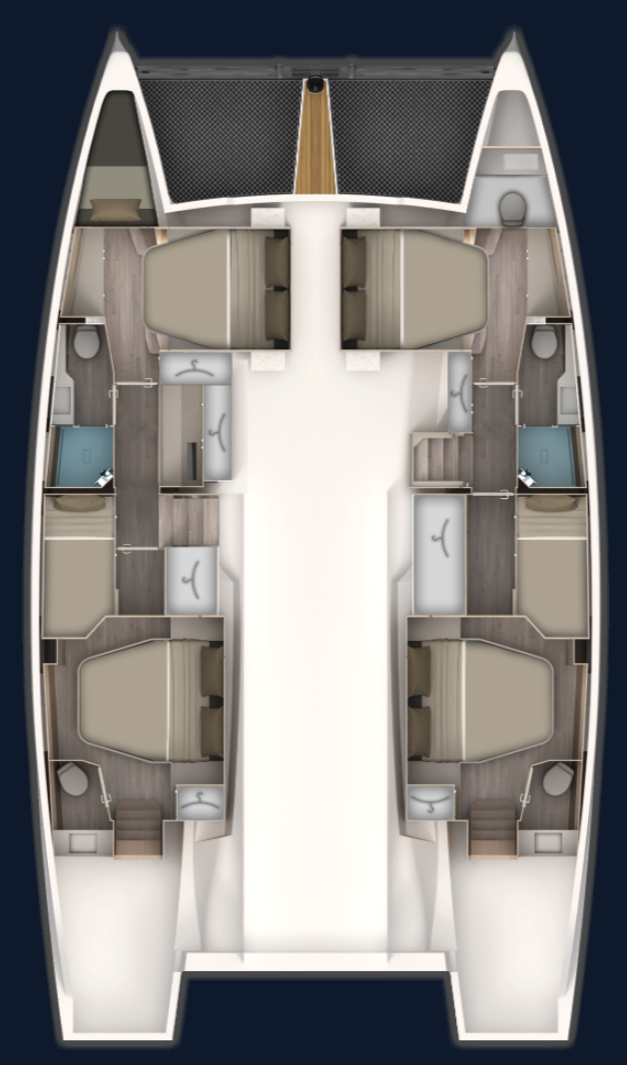 Katamaran Aventura 45 Cajha, Baujahr 2025, liegt im Trogir, Yachtclub Seget (Marina Baotić), Split & Umgebung, Kroatien vor Anker. Es verfügt über 4 + 1 Kabinen und bietet Platz für 8 + 1 Personen mit 4 Toiletten. Bettwäsche und Küchenausstattung sind im Preis inbegriffen.