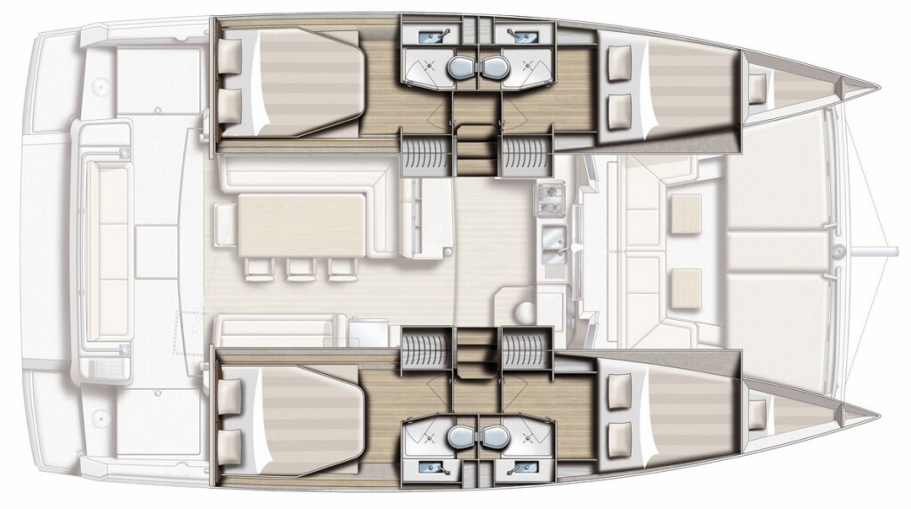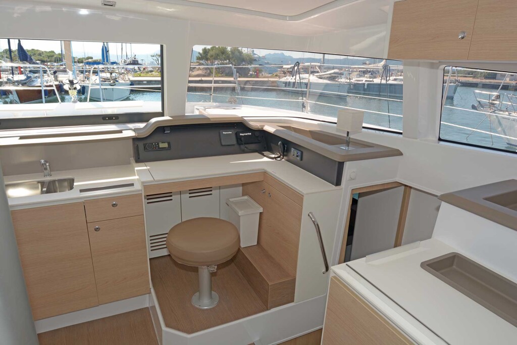 Katamaran Bali 4.1 Alba, Baujahr 2019, liegt im Sardinien, Cannigione, Sardinien, Italien vor Anker. Es verfügt über 4 + 2 Kabinen und bietet Platz für 8 + 2 Personen mit 4 Toiletten. Bettwäsche und Küchenausstattung sind im Preis inbegriffen.