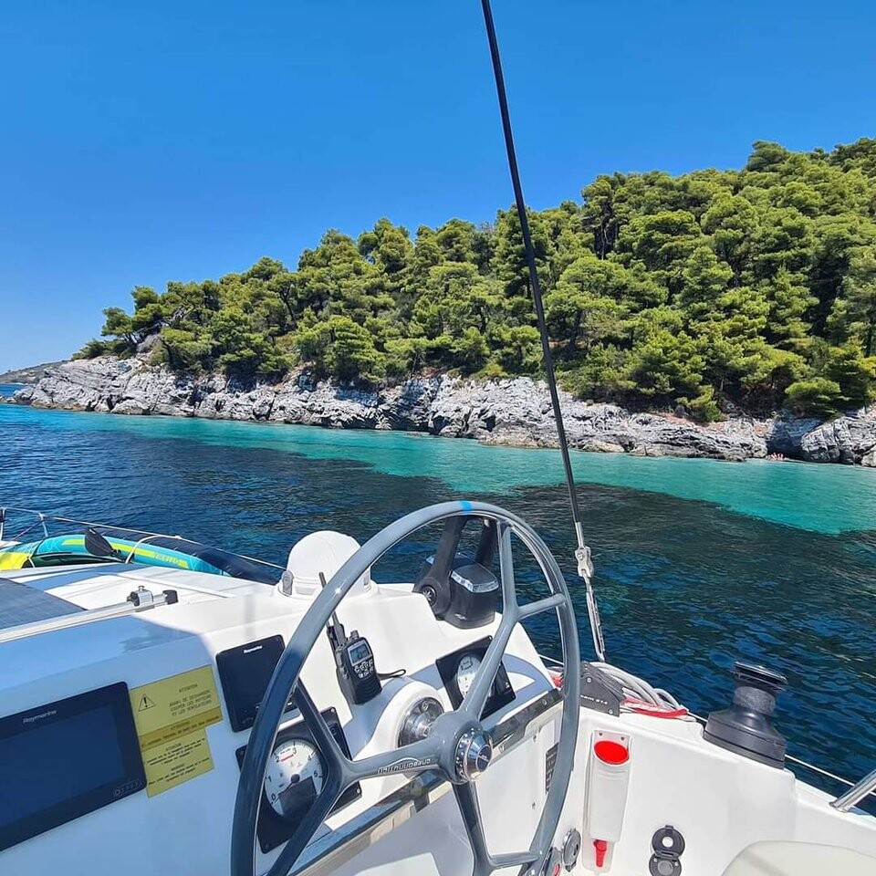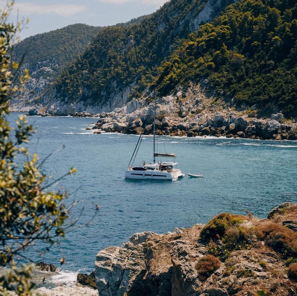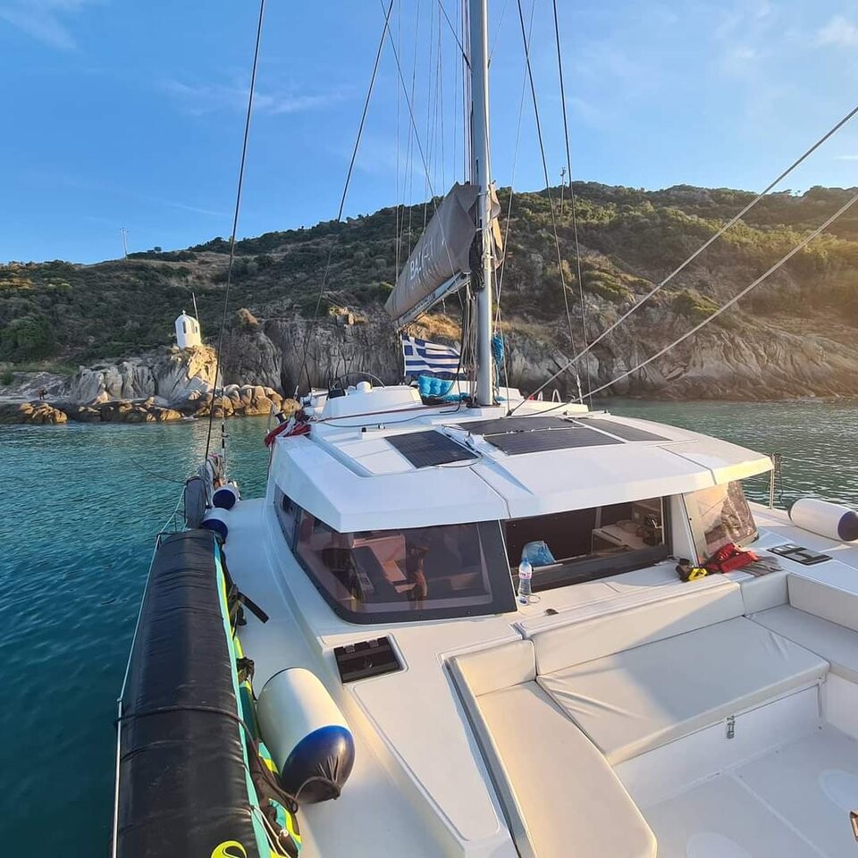 Katamaran Bali 4.1 Iris, Baujahr 2019, liegt im Volos, Sporaden, Griechenland vor Anker. Es verfügt über 4 + 1 Kabinen und bietet Platz für 8 + 2 + 1 Personen mit 3 Toiletten. Bettwäsche und Küchenausstattung sind im Preis inbegriffen.