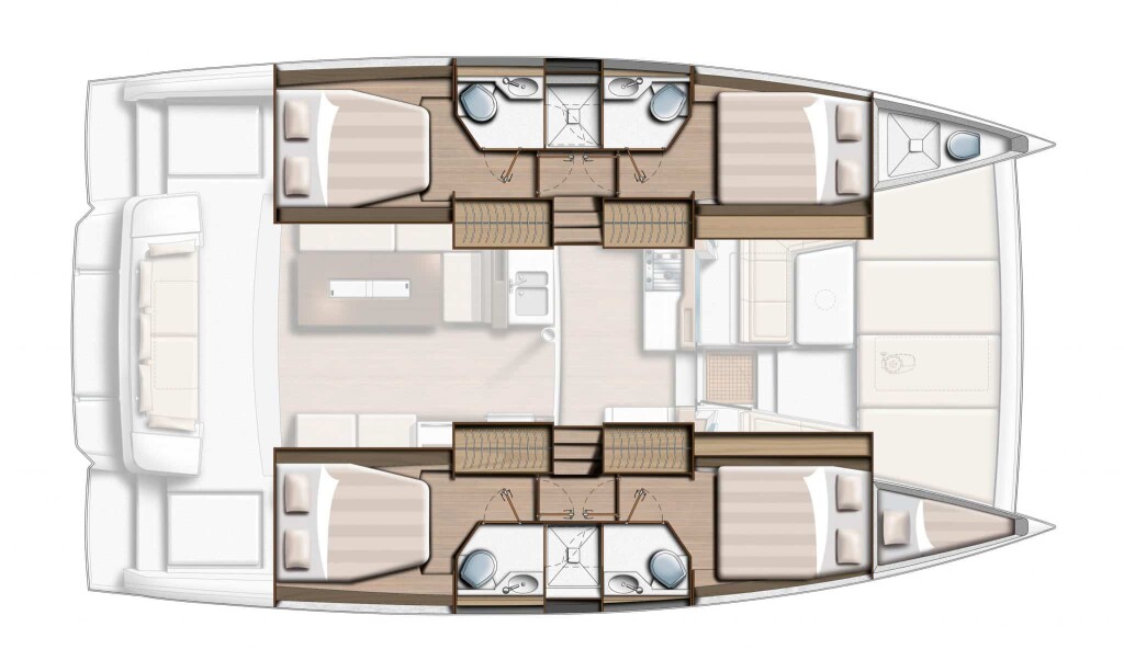Katamaran Bali 4.2 Mademoiselle, Baujahr 2024, liegt im Marina Frapa, Rogoznica, Sibenik & Umgebung, Kroatien vor Anker. Es verfügt über 4 + 1 Kabinen und bietet Platz für 8 + 2 + 1 Personen mit 4 + 1 Toiletten. Bettwäsche und Küchenausstattung sind im Preis inbegriffen.