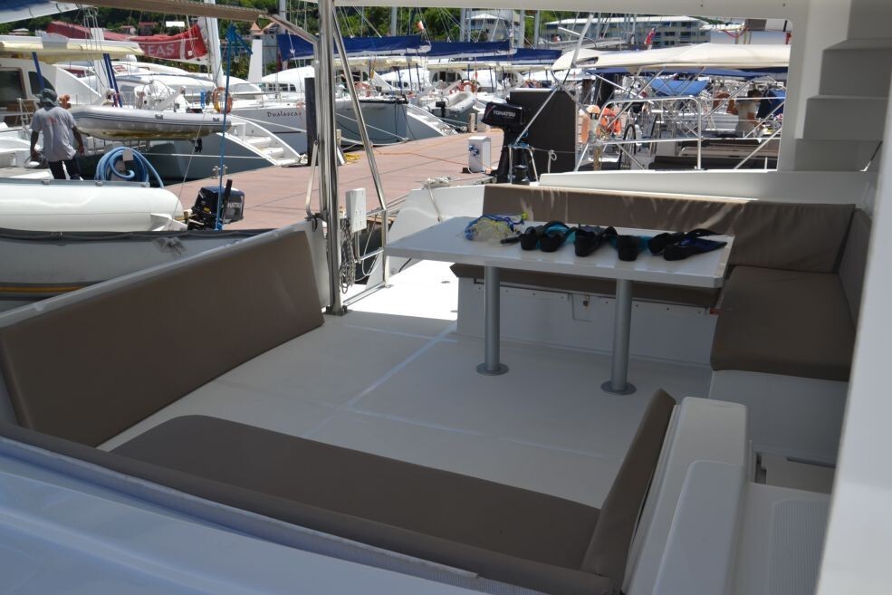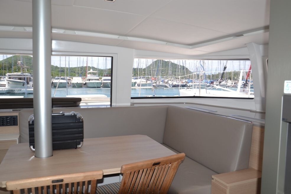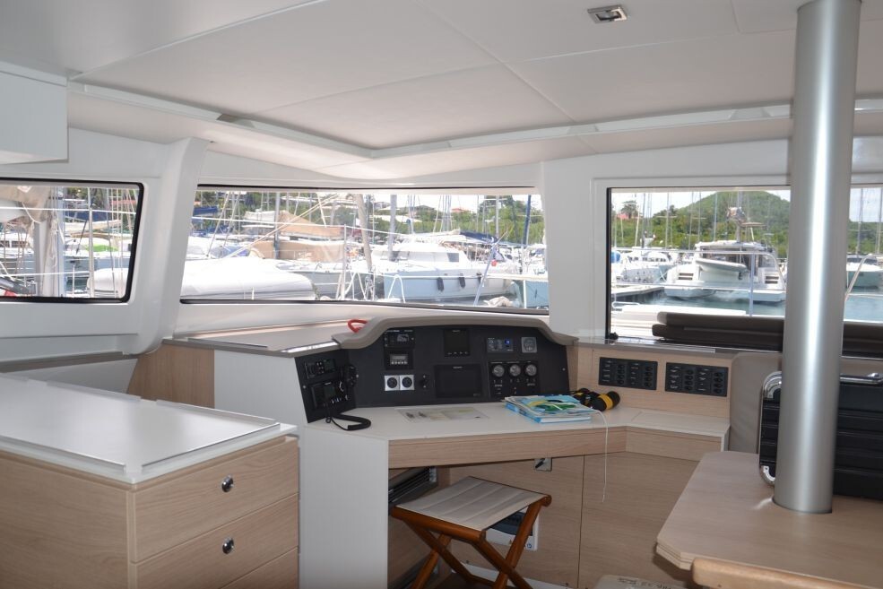 Katamaran Bali 4.5 FARALLO, Baujahr 2018, liegt im Martinique, Le Marin, Martinique, Karibik vor Anker. Es verfügt über 4 + 2 Kabinen und bietet Platz für 8 + 2 Personen mit 4 Toiletten. Bettwäsche und Küchenausstattung sind im Preis inbegriffen.