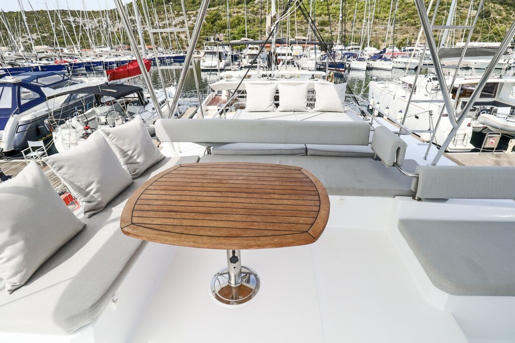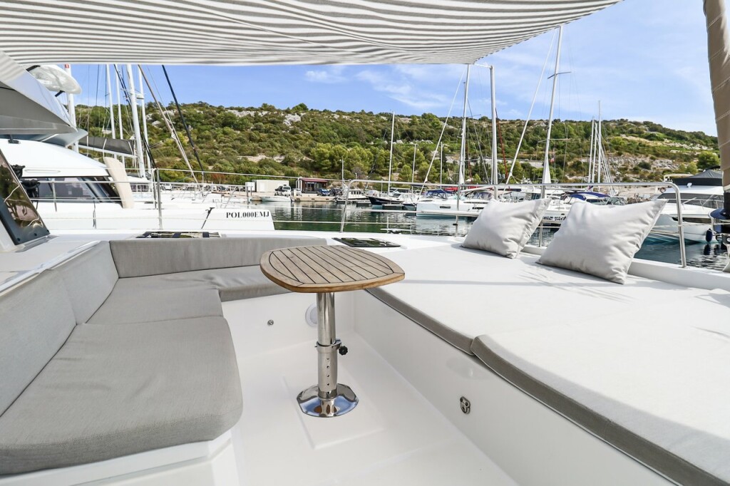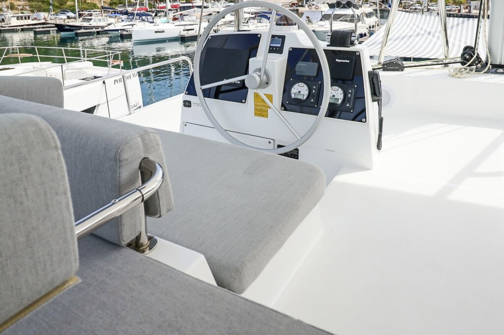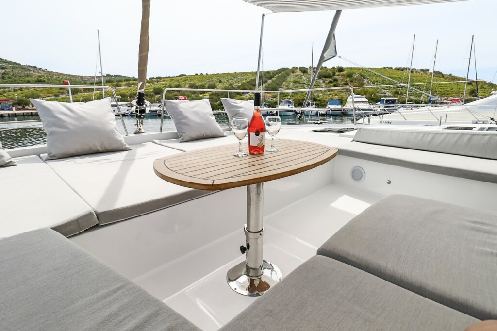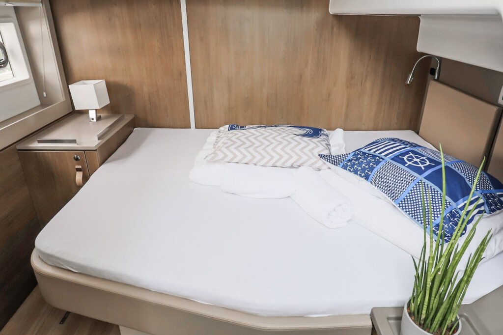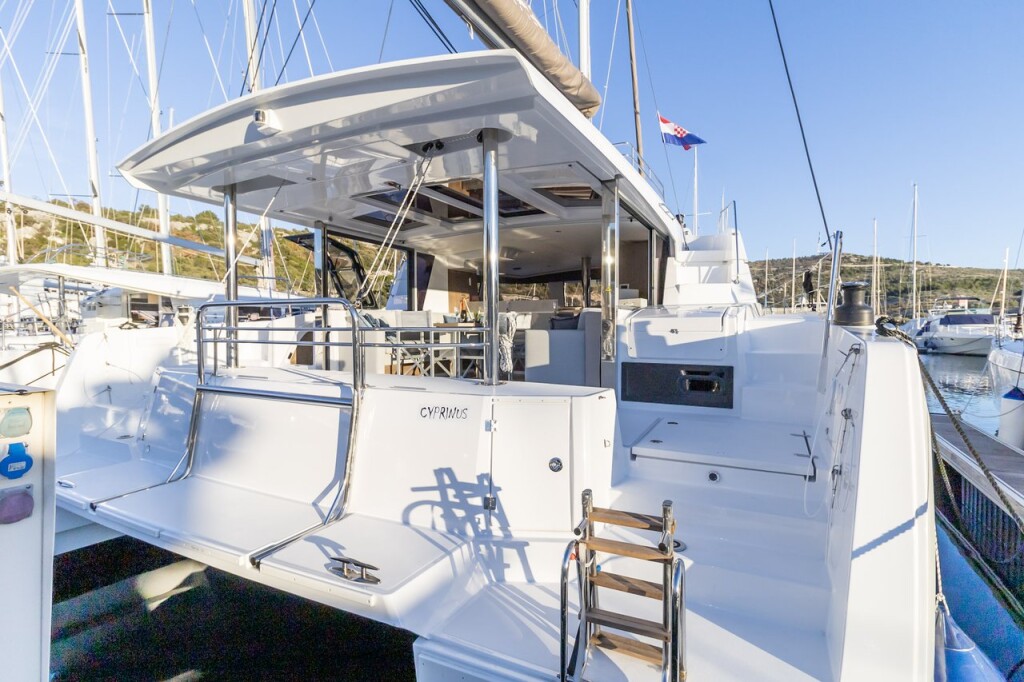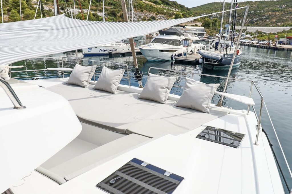 Katamaran Bali 4.6 Cyprinus, Baujahr 2022, liegt im Marina Kremik, Primosten, Sibenik & Umgebung, Kroatien vor Anker. Es verfügt über 5 + 2 Kabinen und bietet Platz für 10 + 1 + 1 Personen mit 4 Toiletten. Bettwäsche und Küchenausstattung sind im Preis inbegriffen.