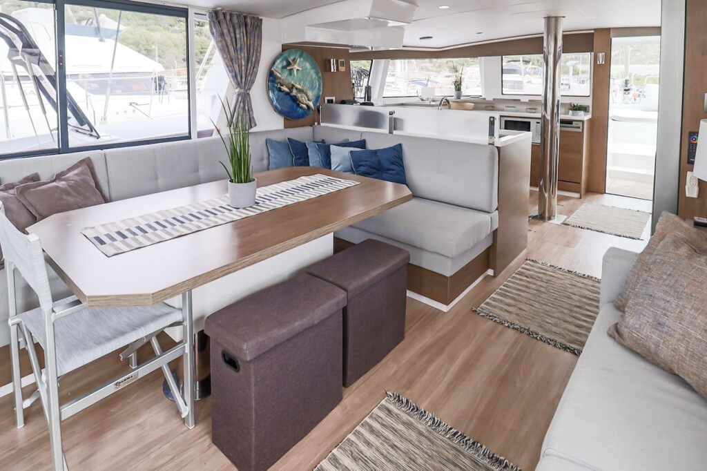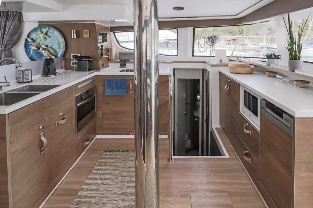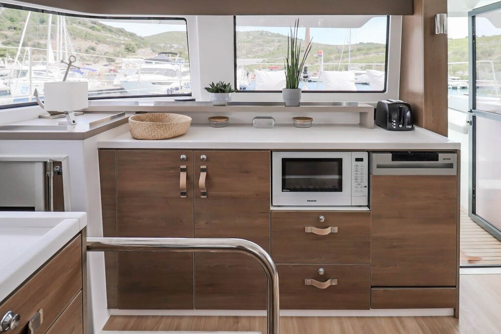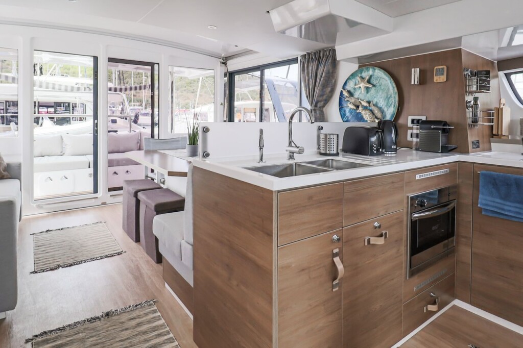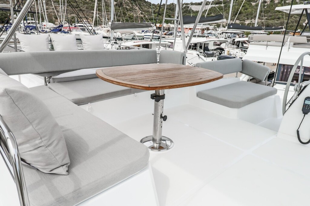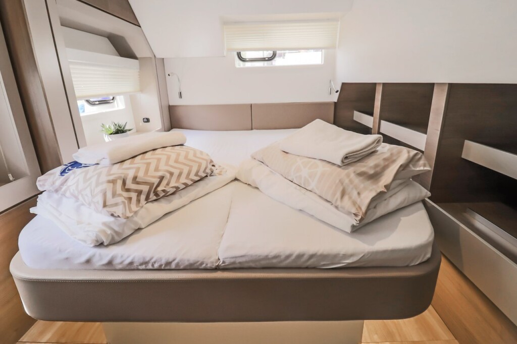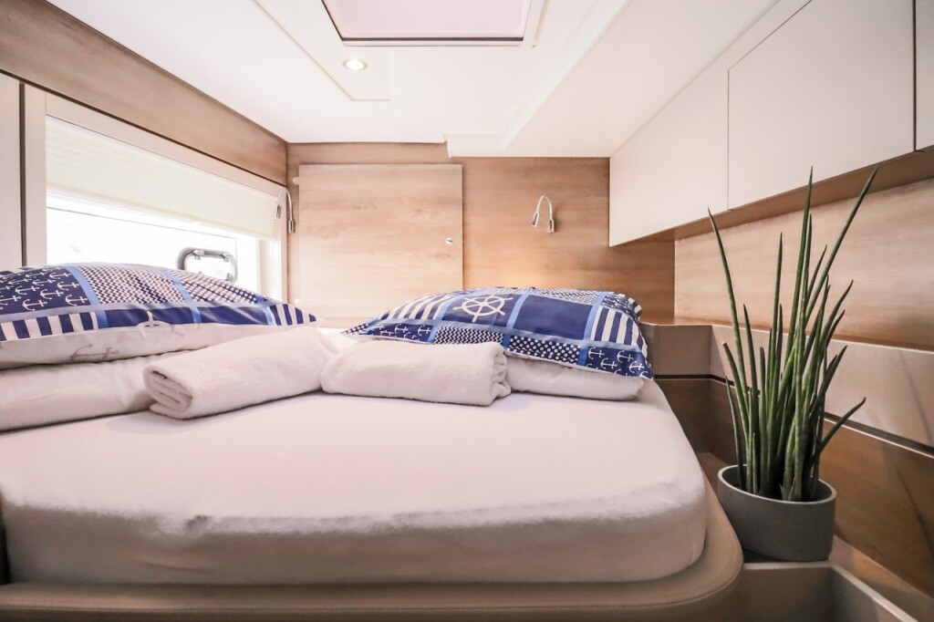 Katamaran Bali 4.6 Cyprinus, Baujahr 2022, liegt im Marina Kremik, Primosten, Sibenik & Umgebung, Kroatien vor Anker. Es verfügt über 5 + 2 Kabinen und bietet Platz für 10 + 1 + 1 Personen mit 4 Toiletten. Bettwäsche und Küchenausstattung sind im Preis inbegriffen.