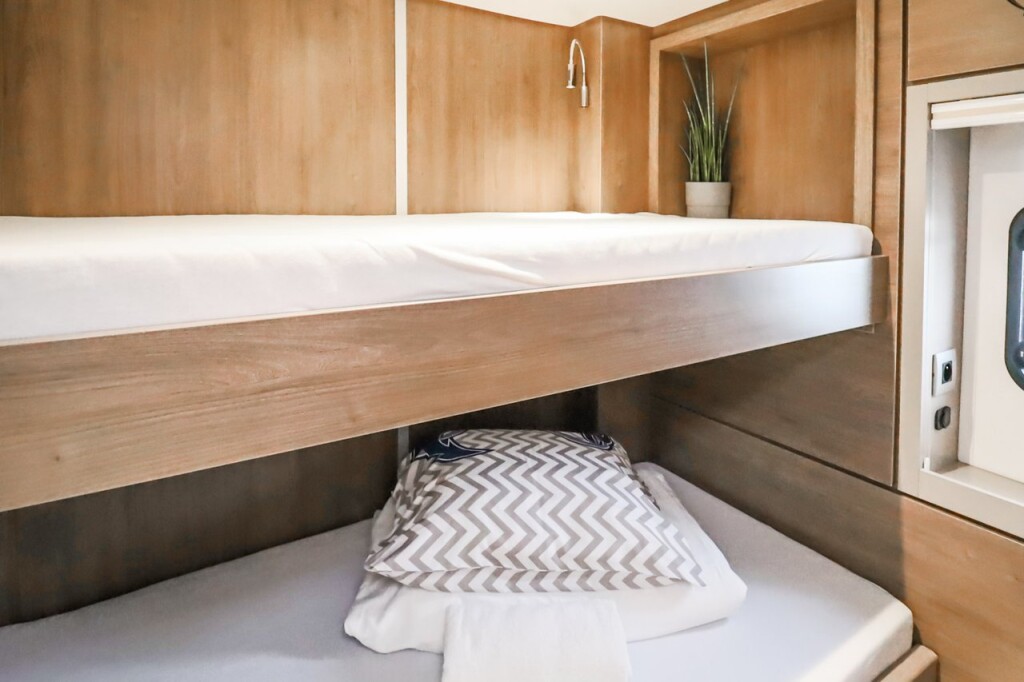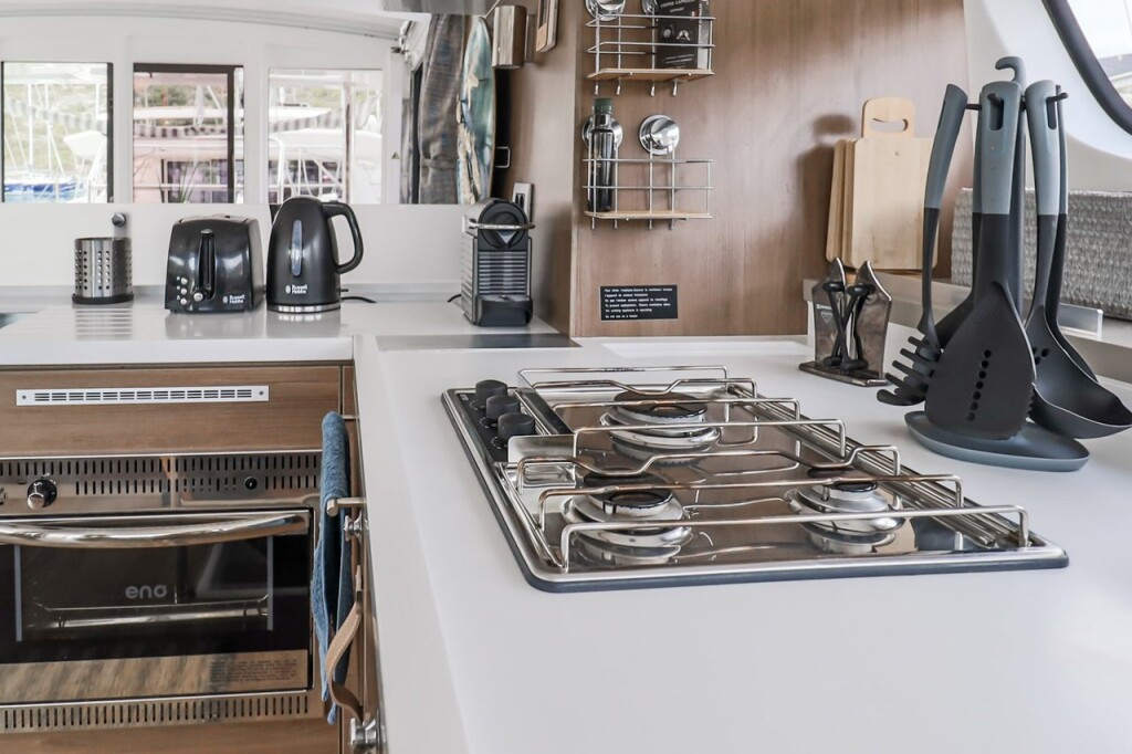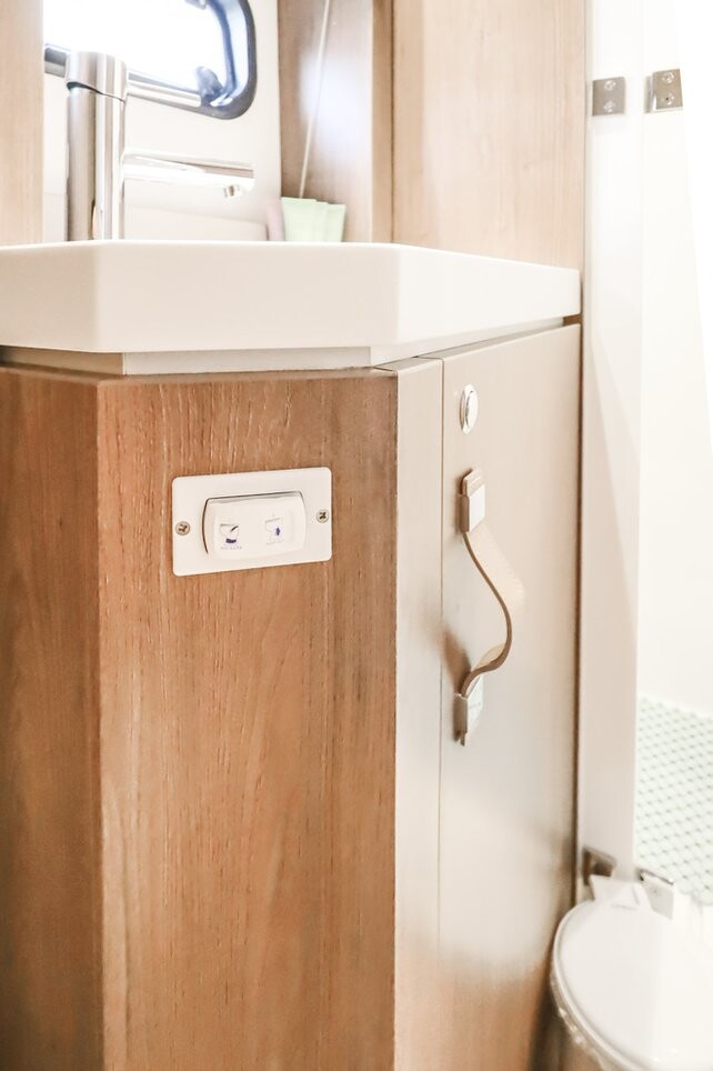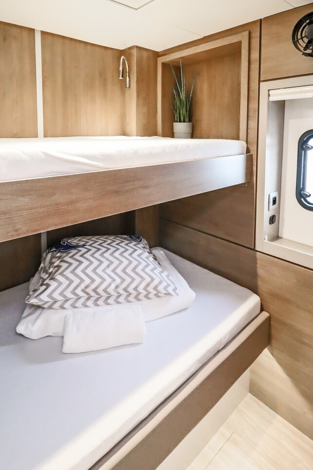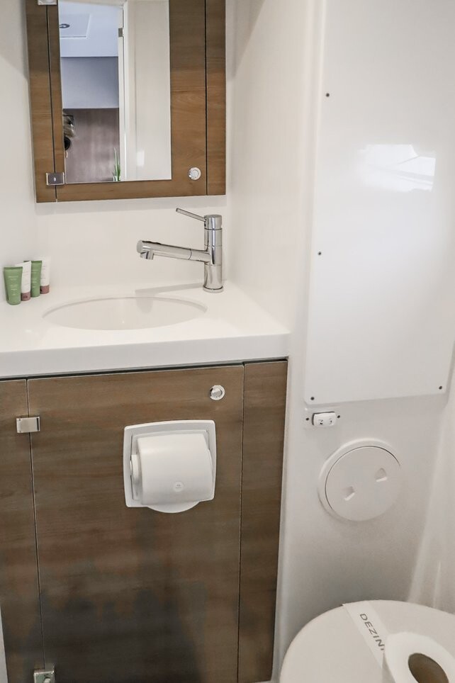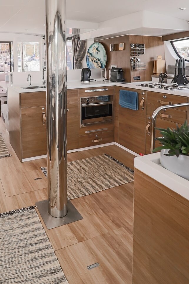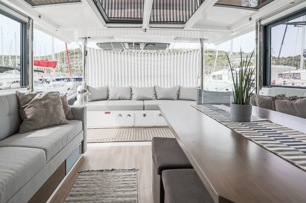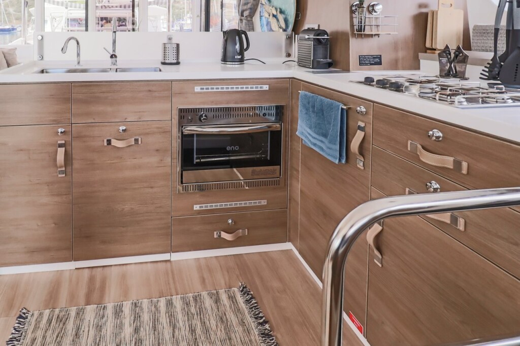 Katamaran Bali 4.6 Cyprinus, Baujahr 2022, liegt im Marina Kremik, Primosten, Sibenik & Umgebung, Kroatien vor Anker. Es verfügt über 5 + 2 Kabinen und bietet Platz für 10 + 1 + 1 Personen mit 4 Toiletten. Bettwäsche und Küchenausstattung sind im Preis inbegriffen.