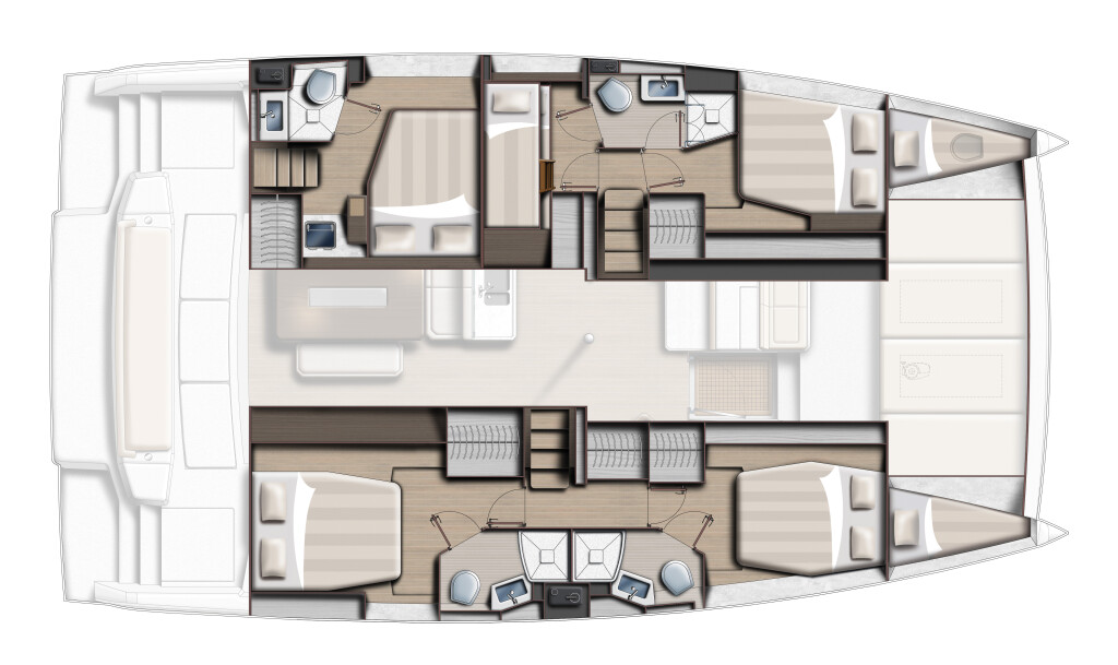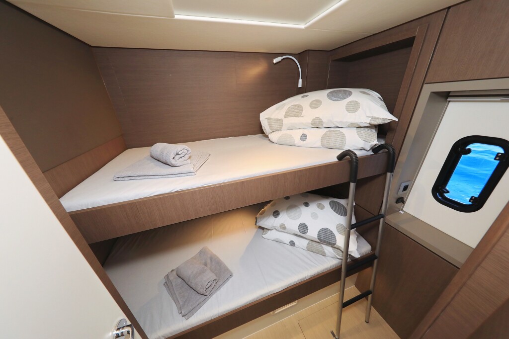 Katamaran Bali 4.6 Joie de vivre, Baujahr 2021, liegt im Trogir, Yachtclub Seget (Marina Baotić), Split & Umgebung, Kroatien vor Anker. Es verfügt über 5 + 2 Kabinen und bietet Platz für 10 + 1 + 1 Personen mit 4 + 1 Toiletten. Bettwäsche und Küchenausstattung sind im Preis inbegriffen.