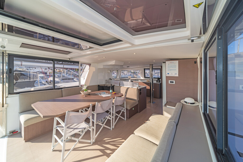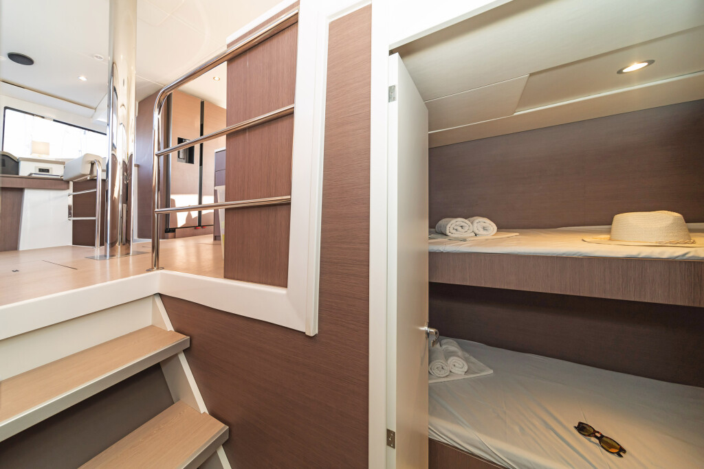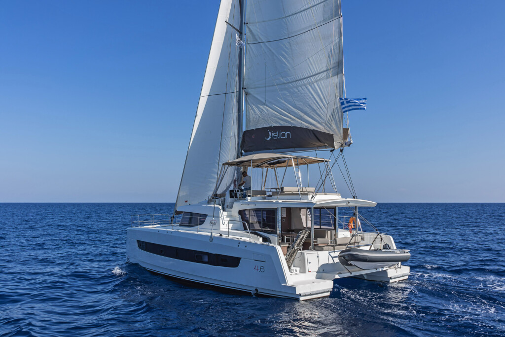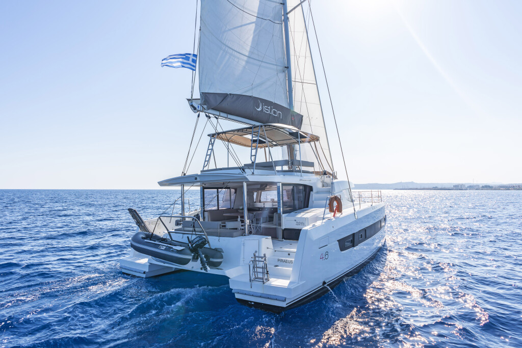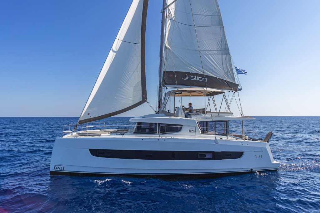 Katamaran Bali 4.6 Rafaela, Baujahr 2021, liegt im Preveza Main Port, Ionisches Meer, Griechenland vor Anker. Es verfügt über 7 + 2 Kabinen und bietet Platz für 10 + 2 Personen mit 4 + 1 Toiletten. Bettwäsche und Küchenausstattung sind im Preis inbegriffen.