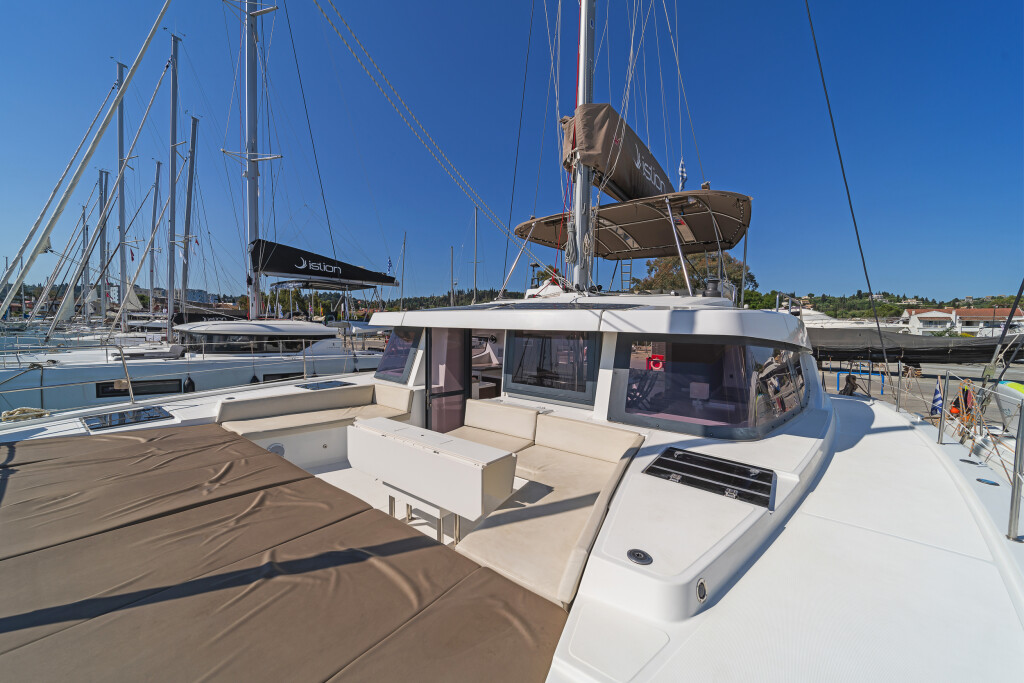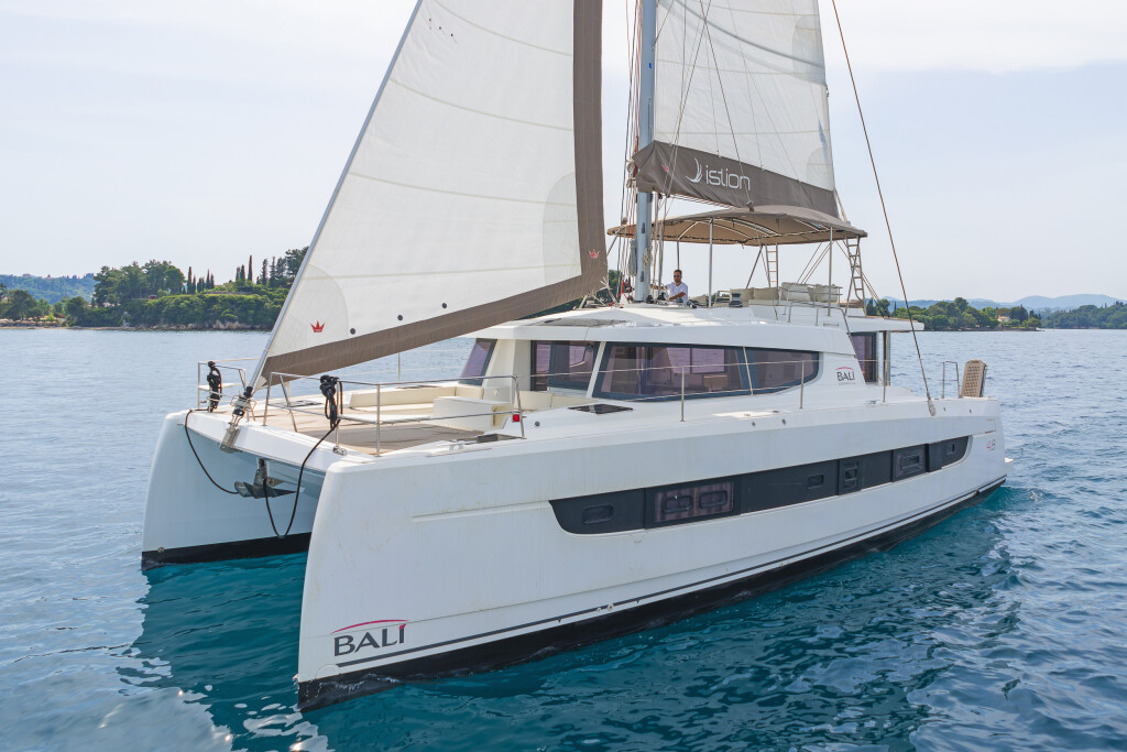 Katamaran Bali 4.8 Laguana, Baujahr 2020, liegt im Corfu, Gouvia Marina, Ionisches Meer, Griechenland vor Anker. Es verfügt über 6 Kabinen und bietet Platz für 12 Personen mit 6 Toiletten. Bettwäsche und Küchenausstattung sind im Preis inbegriffen.