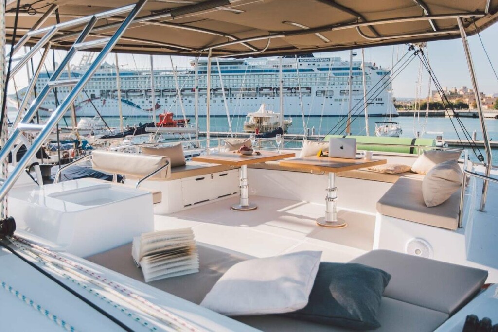 Katamaran Bali 5.4 Elena, Baujahr 2020, liegt im Salerno, Marina d'Arechi, Campania, Italien vor Anker. Es verfügt über 4 + 3 Kabinen und bietet Platz für 8 Personen mit 4 + 3 Toiletten. Bettwäsche und Küchenausstattung sind im Preis inbegriffen.