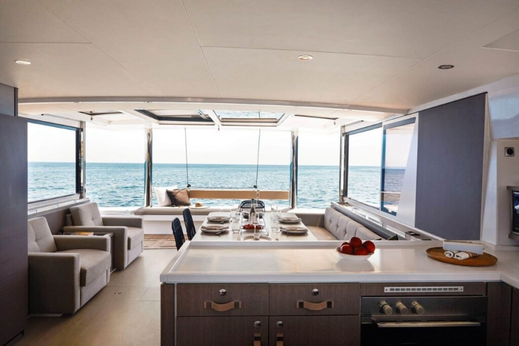 Katamaran Bali 5.4 GILISS, Baujahr 2024, liegt im Polynesia, Raiatea, Französisch Polynesien, Französisch Polynesien vor Anker. Es verfügt über 5 + 1 Kabinen und bietet Platz für 10 + 1 Personen mit 5 + 1 Toiletten. Bettwäsche und Küchenausstattung sind im Preis inbegriffen.