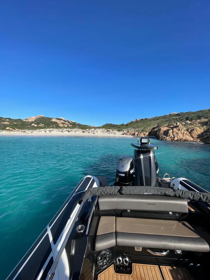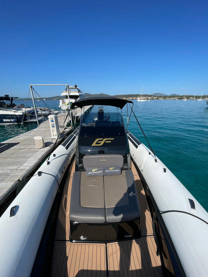 Schlauchboot Brig Eagle 10 Goldfinger, Baujahr 2022, liegt im Marina di Golfo Aranci, Sardinien, Italien vor Anker. Es verfügt über 1 Kabinen und bietet Platz für 1 Personen mit 1 Toiletten. Bettwäsche und Küchenausstattung sind im Preis inbegriffen.