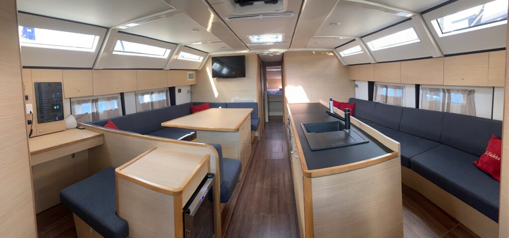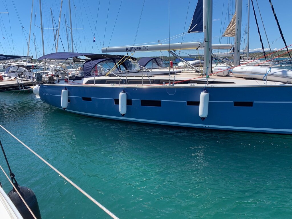 Segelyacht D&D Kufner 50 Rosso, Baujahr 2020, liegt im Trogir, Yachtclub Seget (Marina Baotić), Split & Umgebung, Kroatien vor Anker. Es verfügt über 5 Kabinen und bietet Platz für 10 + 1 Personen mit 3 Toiletten. Bettwäsche und Küchenausstattung sind im Preis inbegriffen.