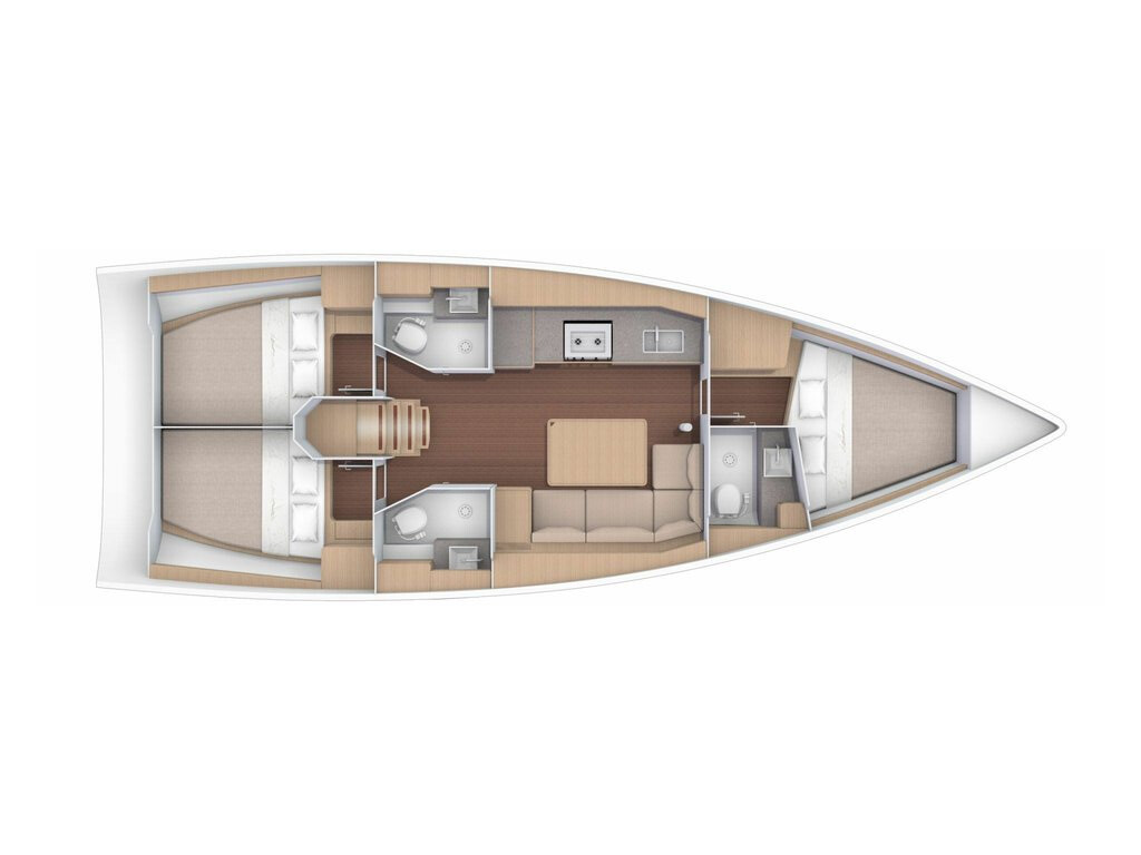 Segelyacht Dufour 390 GL Theodora, Baujahr 2022, liegt im Preveza Main Port, Ionisches Meer, Griechenland vor Anker. Es verfügt über 3 Kabinen und bietet Platz für 6 + 2 Personen mit 3 Toiletten. Bettwäsche und Küchenausstattung sind im Preis inbegriffen.