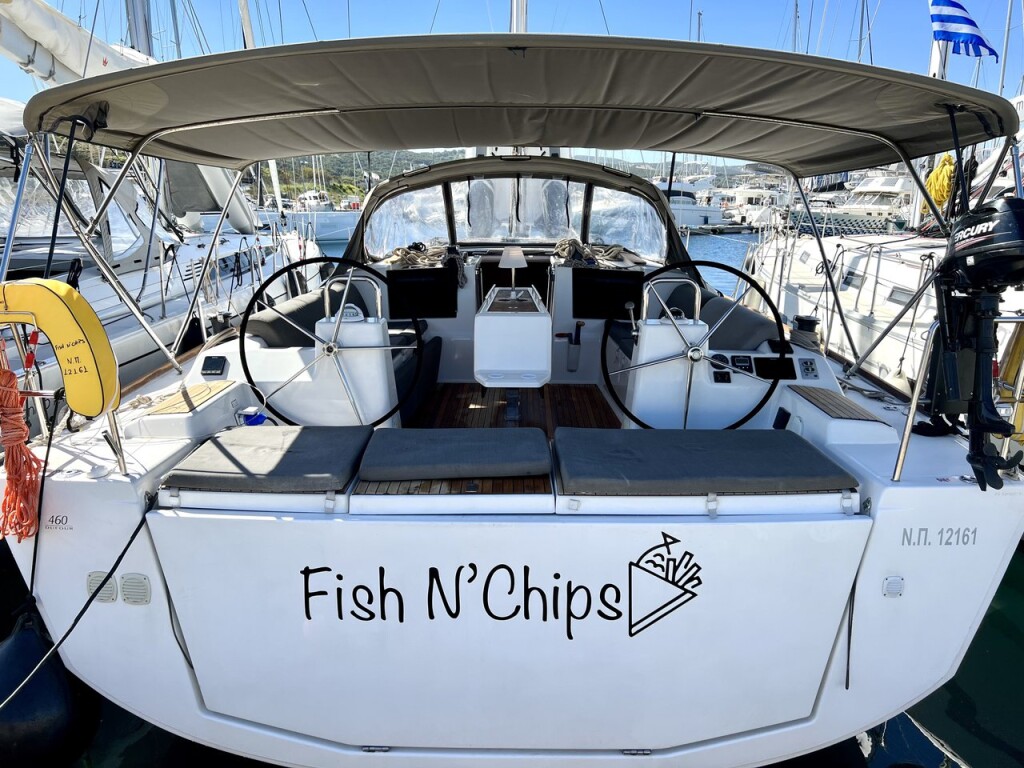 Segelyacht Dufour 460 GL Fish N'Chips, Baujahr 2019, liegt im Lavrion - Olympic Marine, Peloponnes, Griechenland vor Anker. Es verfügt über 5 Kabinen und bietet Platz für 10 + 2 Personen mit 3 Toiletten. Bettwäsche und Küchenausstattung sind im Preis inbegriffen.