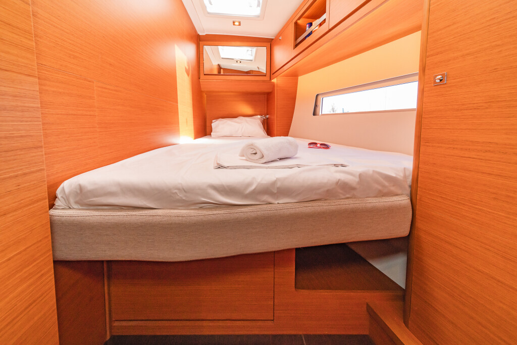 Segelyacht Dufour 470 Imagine, Baujahr 2023, liegt im Kos, Kos Marina, Dodekanes, Griechenland vor Anker. Es verfügt über 4 + 1 Kabinen und bietet Platz für 8 + 1 Personen mit 4 Toiletten. Bettwäsche und Küchenausstattung sind im Preis inbegriffen.