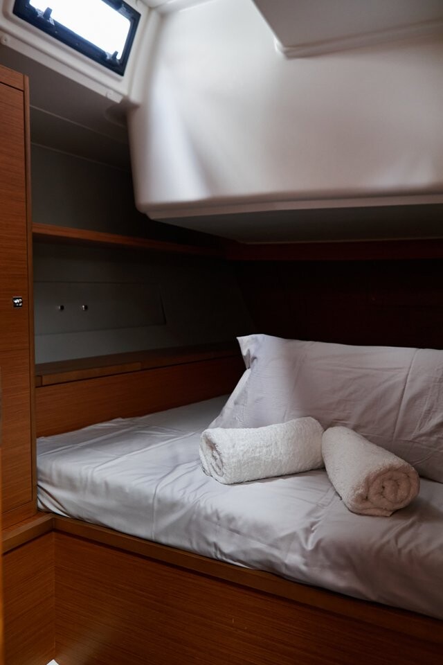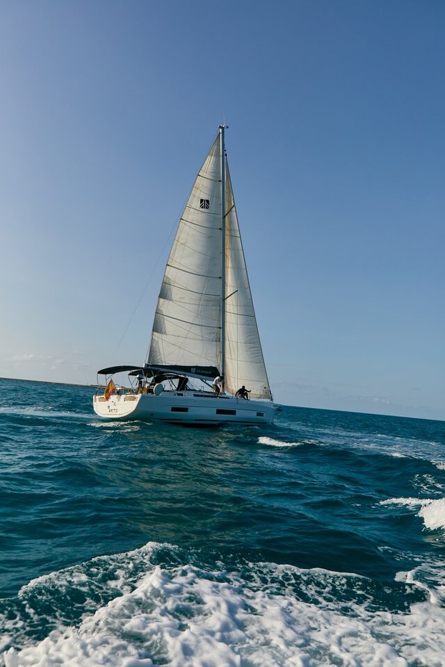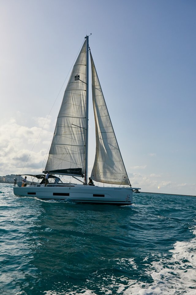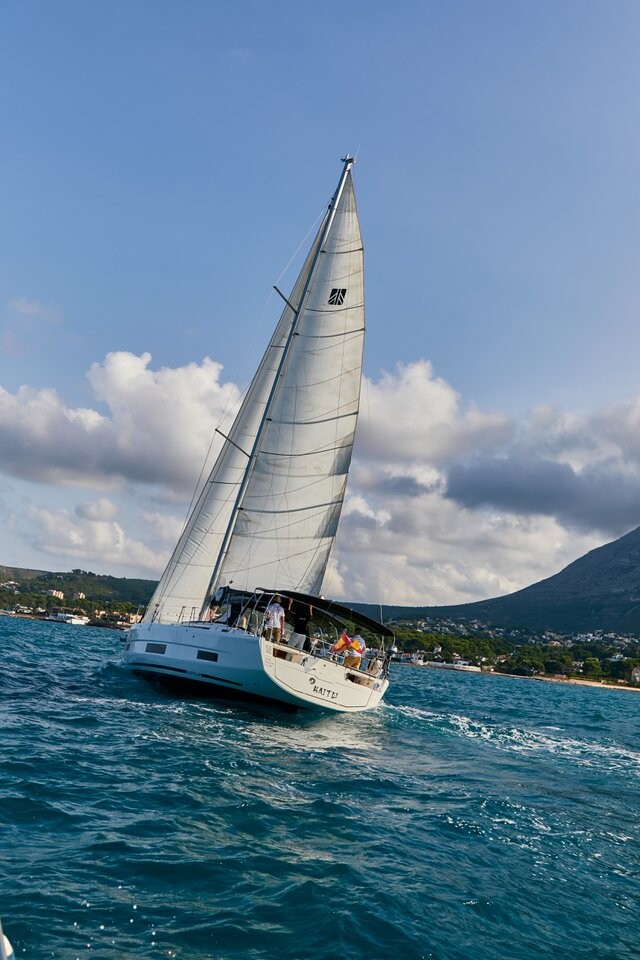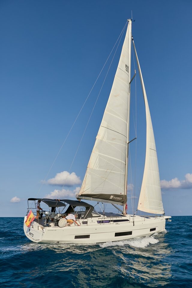 Segelyacht Dufour 470 Kaito, Baujahr 2021, liegt im Denia, Marina de Dénia, Alicante, Spanien vor Anker. Es verfügt über 5 + 1 Kabinen und bietet Platz für 10 + 1 Personen mit 3 Toiletten. Bettwäsche und Küchenausstattung sind im Preis inbegriffen.