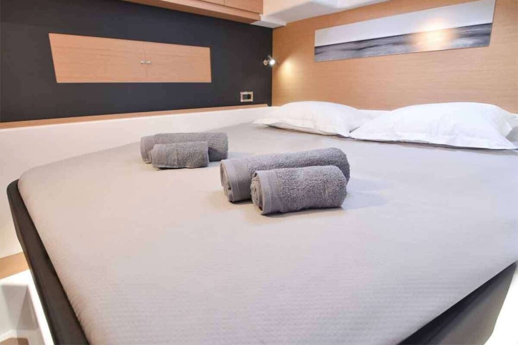 Katamaran Dufour 48 Catamaran Jovy, Baujahr 2021, liegt im Capo D'orlando Marina, Sizilien, Italien vor Anker. Es verfügt über 4 + 2 Kabinen und bietet Platz für 8 Personen mit 4 + 1 Toiletten. Bettwäsche und Küchenausstattung sind im Preis inbegriffen.