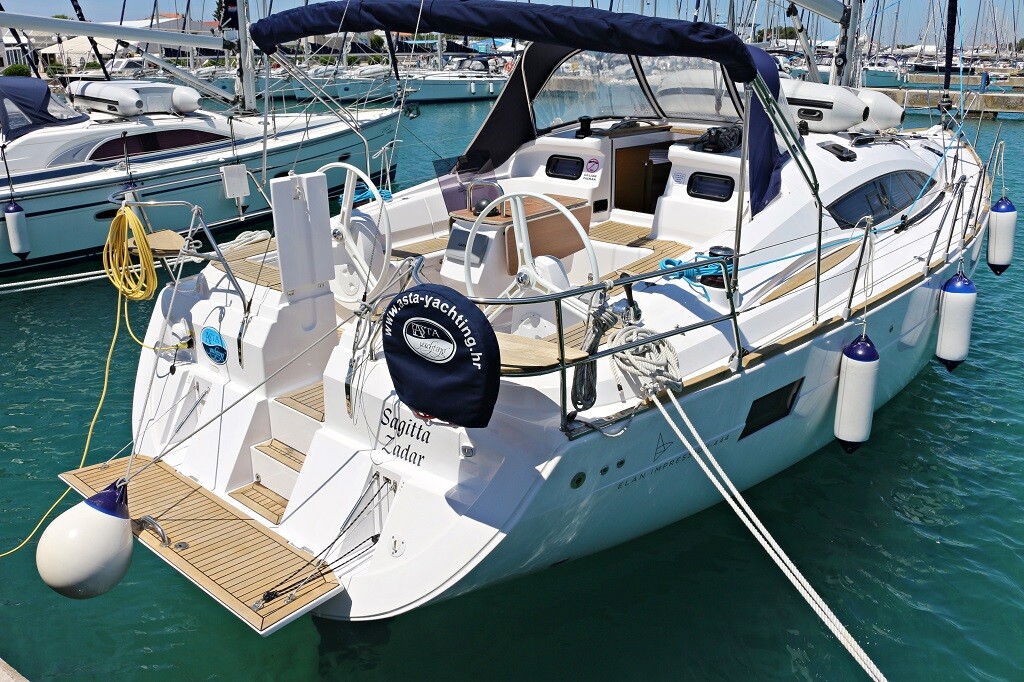 Segelyacht Elan 444 Impression Sagitta, Baujahr 2013, liegt im Sukosan, D-Marin Dalmacija Marina, Zadar & Umgebung, Kroatien vor Anker. Es verfügt über 4 Kabinen und bietet Platz für 8 + 2 Personen mit 2 Toiletten. Bettwäsche und Küchenausstattung sind im Preis inbegriffen.