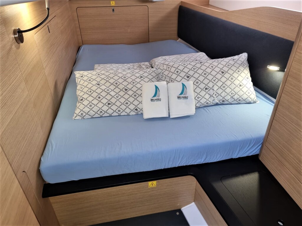 Segelyacht Elan E6 Contessa, Baujahr 2022, liegt im Marina Punat, Krk, Kvarner, Kroatien vor Anker. Es verfügt über 4 Kabinen und bietet Platz für 8 + 2 Personen mit 2 Toiletten. Bettwäsche und Küchenausstattung sind im Preis inbegriffen.