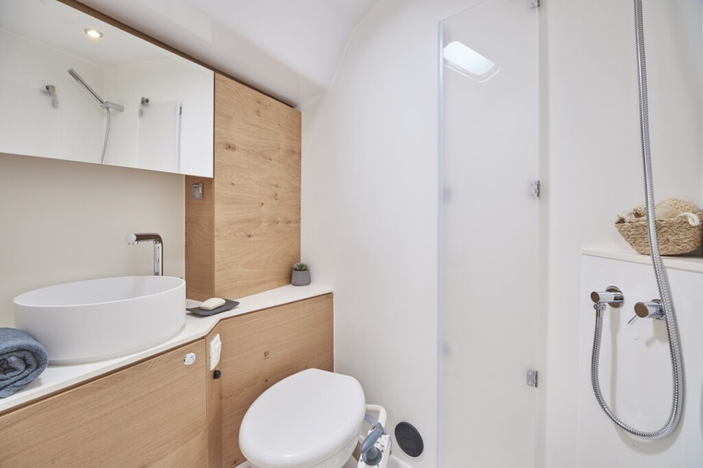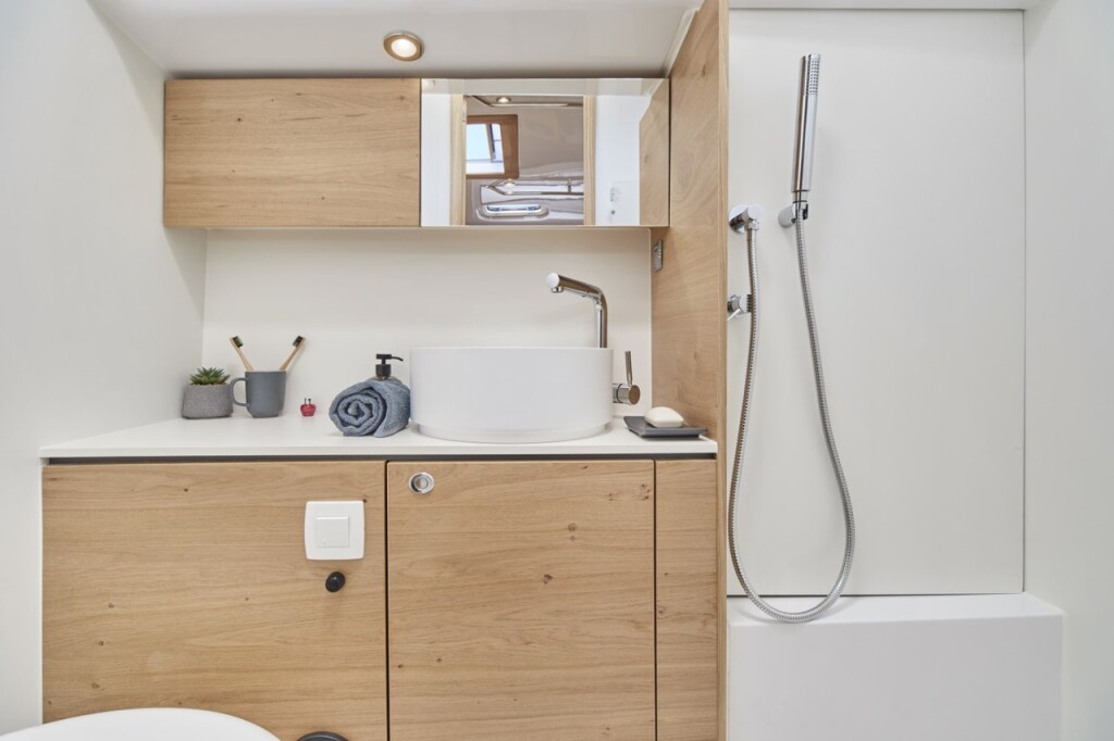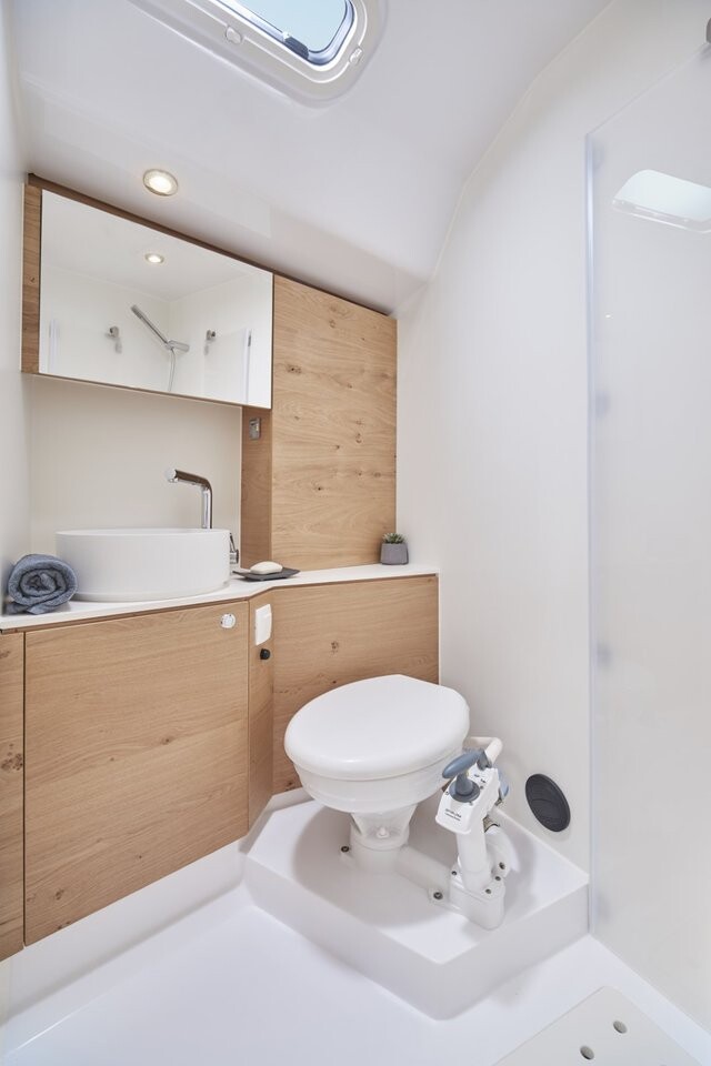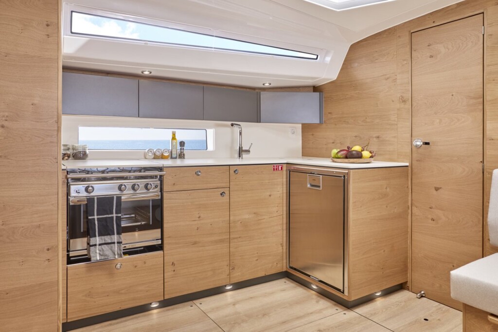 Segelyacht Elan Impression 45 Aurora, Baujahr 2024, liegt im Marina Pirovac, Sibenik & Umgebung, Kroatien vor Anker. Es verfügt über 4 Kabinen und bietet Platz für 8 + 2 Personen mit 2 Toiletten. Bettwäsche und Küchenausstattung sind im Preis inbegriffen.
