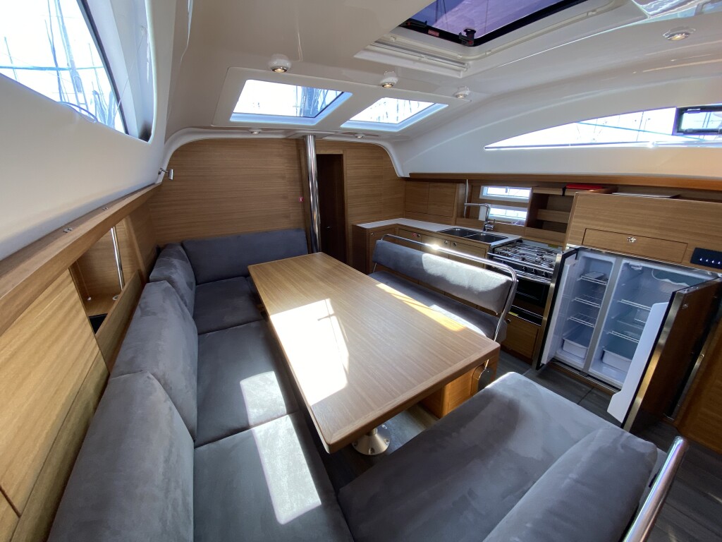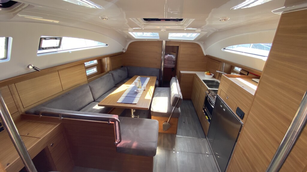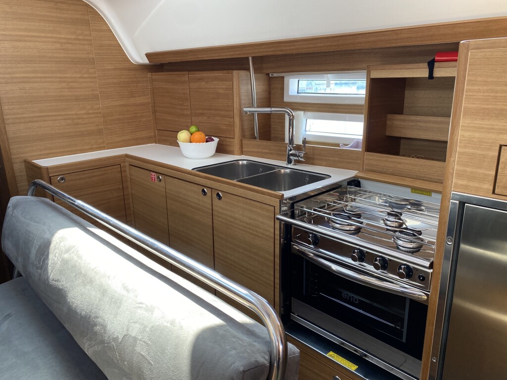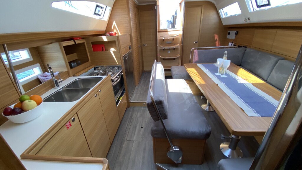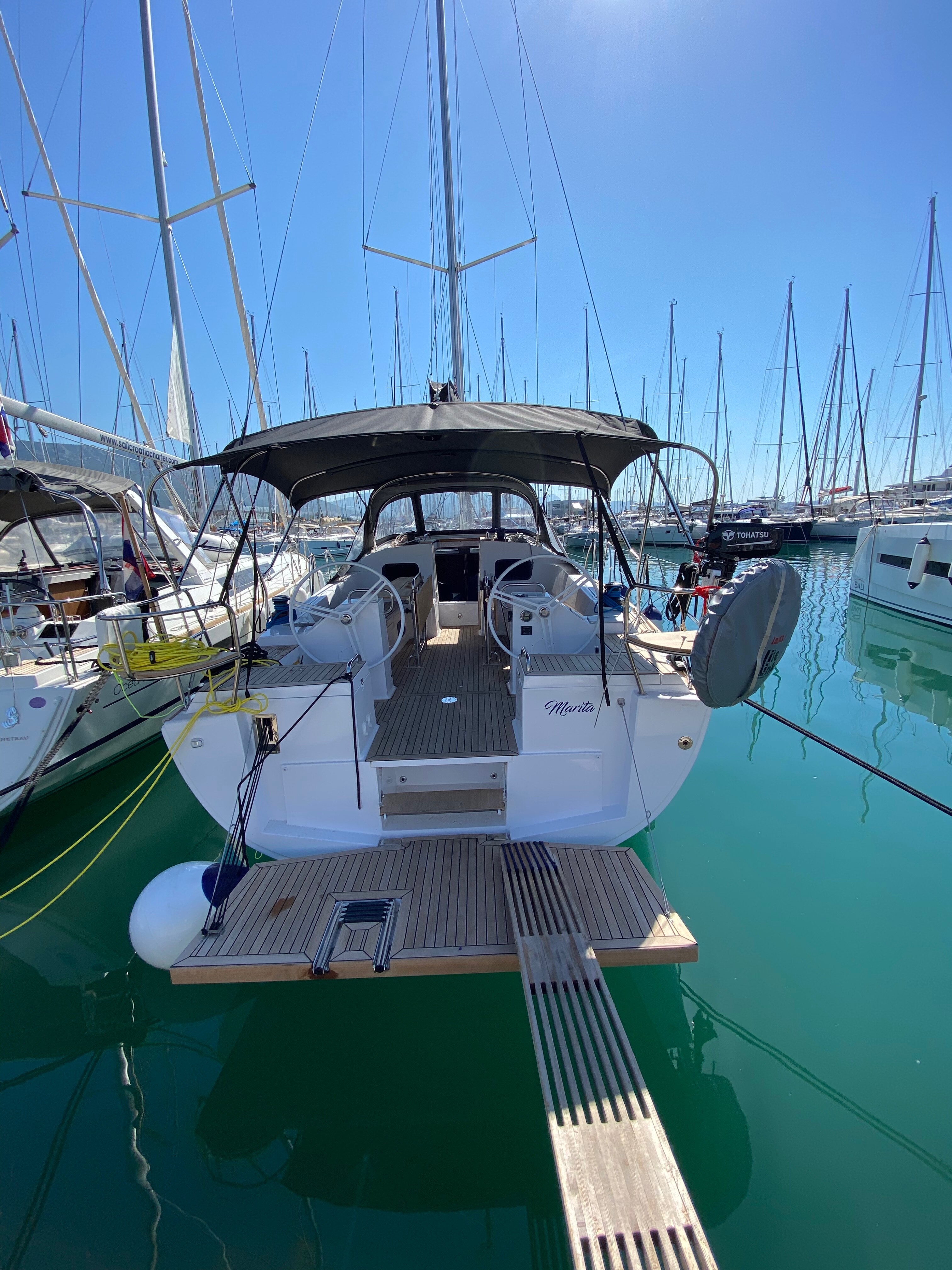 Segelyacht Elan Impression 45.1 Marita, Baujahr 2022, liegt im Marina Kastela, Split & Umgebung, Kroatien vor Anker. Es verfügt über 4 Kabinen und bietet Platz für 8 + 2 Personen mit 2 Toiletten. Bettwäsche und Küchenausstattung sind im Preis inbegriffen.