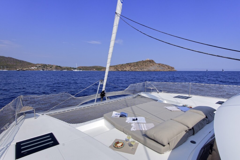 Katamaran Fountaine Pajot Tanna 47 Helidoni, Baujahr 2024, liegt im Volos, Sporaden, Griechenland vor Anker. Es verfügt über 4 + 2 Kabinen und bietet Platz für 8 + 2 Personen mit 4 + 1 Toiletten. Bettwäsche und Küchenausstattung sind im Preis inbegriffen.