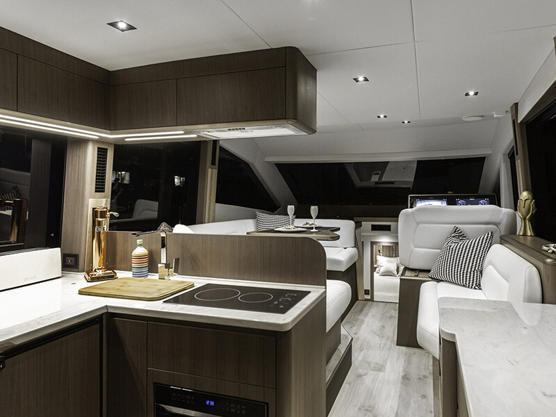 Motoryacht Galeon 480 Il Sogno V, Baujahr 2025, liegt im Marina Mandalina, Sibenik, Sibenik & Umgebung, Kroatien vor Anker. Es verfügt über 3 Kabinen und bietet Platz für 6 + 2 Personen mit 2 Toiletten. Bettwäsche und Küchenausstattung sind im Preis inbegriffen.