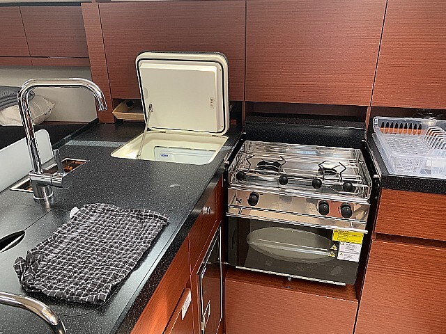 Segelyacht Hanse 418 Piranha, Baujahr 2021, liegt im Lefkas, D-Marin, Ionisches Meer, Griechenland vor Anker. Es verfügt über 3 Kabinen und bietet Platz für 6 + 2 Personen mit 2 Toiletten. Bettwäsche und Küchenausstattung sind im Preis inbegriffen.