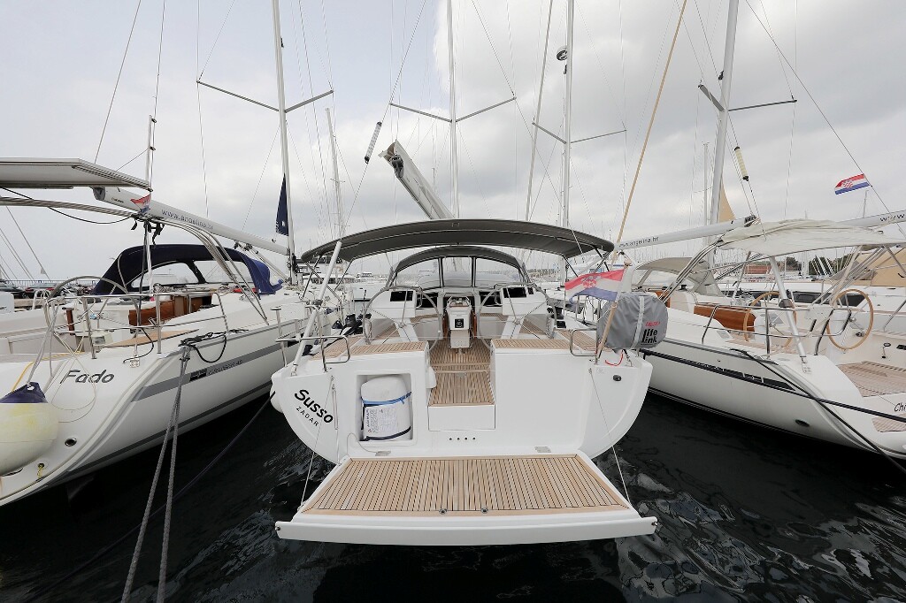 Segelyacht Hanse 455 Susso, Baujahr 2018, liegt im Marina Šangulin, Biograd, Zadar & Umgebung, Kroatien vor Anker. Es verfügt über 3 Kabinen und bietet Platz für 6 + 2 Personen mit 2 Toiletten. Bettwäsche und Küchenausstattung sind im Preis inbegriffen.