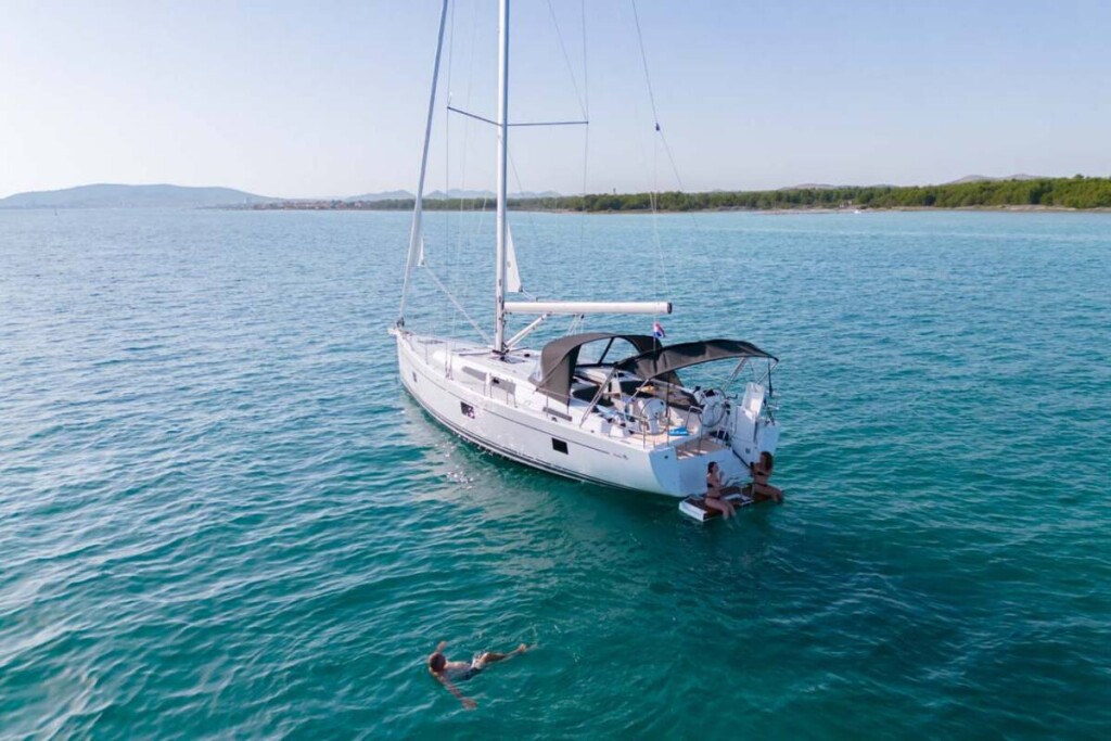 Segelyacht Hanse 508 Frizzante, Baujahr 2025, liegt im Trogir, Yachtclub Seget (Marina Baotić), Split & Umgebung, Kroatien vor Anker. Es verfügt über 5 Kabinen und bietet Platz für 10 + 1 Personen mit 3 Toiletten. Bettwäsche und Küchenausstattung sind im Preis inbegriffen.