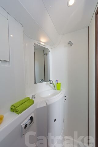 Katamaran Lagoon 380 S2 Catcake, Baujahr 2018, liegt im Lefkas main port, Ionisches Meer, Griechenland vor Anker. Es verfügt über 4 + 2 Kabinen und bietet Platz für 8 + 2 Personen mit 2 Toiletten. Bettwäsche und Küchenausstattung sind im Preis inbegriffen.