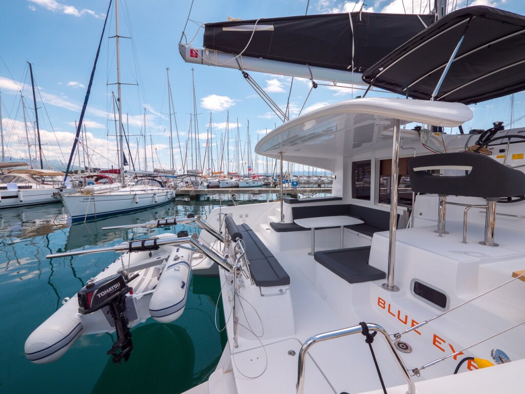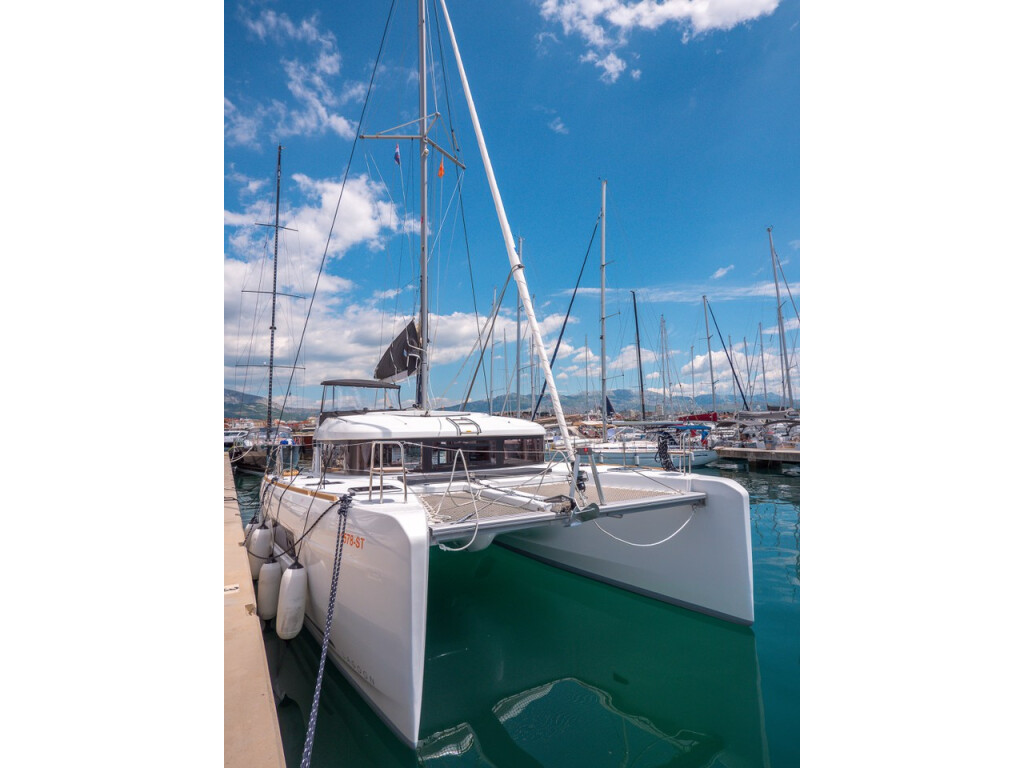 Katamaran Lagoon 40 Blue Eyes, Baujahr 2019, liegt im ACI Marina Split, Split & Umgebung, Kroatien vor Anker. Es verfügt über 4 + 2 Kabinen und bietet Platz für 8 + 2 + 2 Personen mit 4 Toiletten. Bettwäsche und Küchenausstattung sind im Preis inbegriffen.