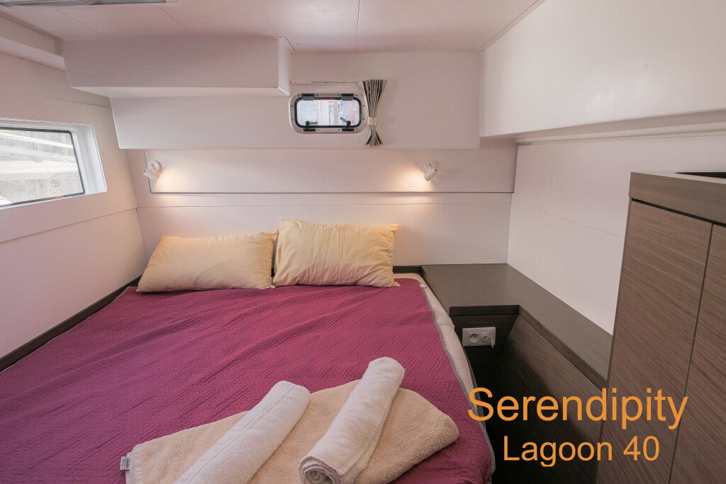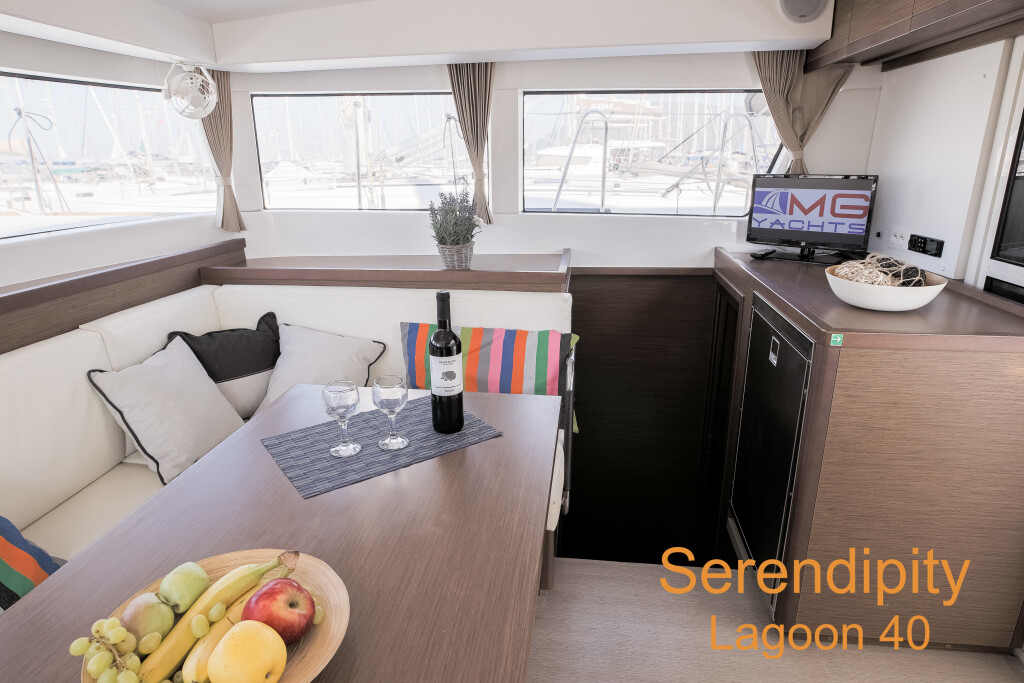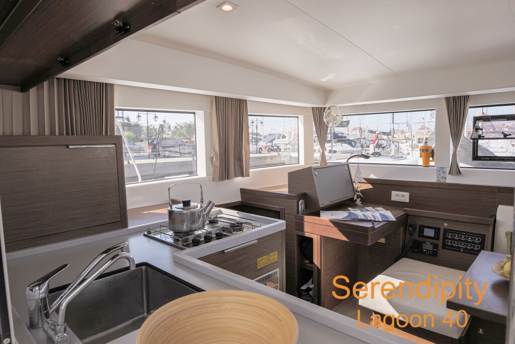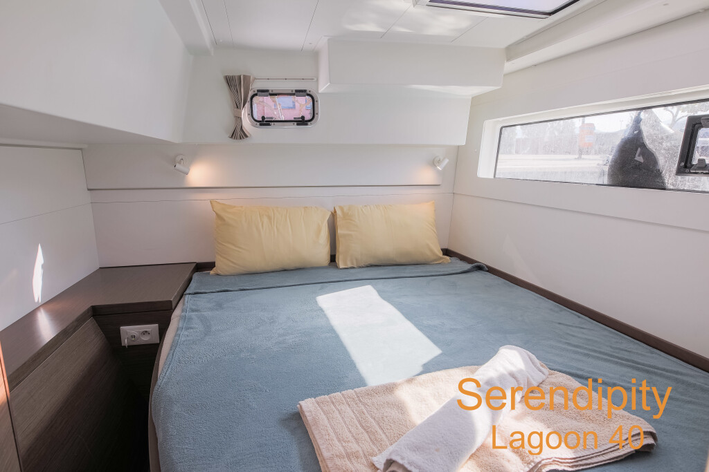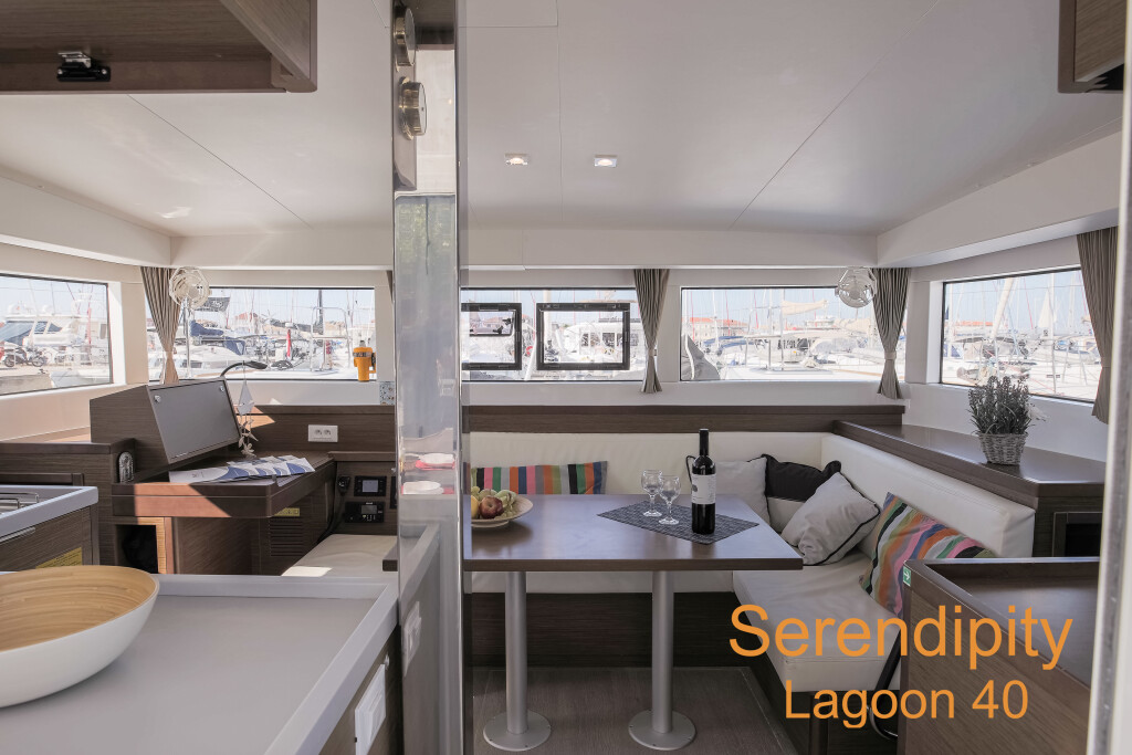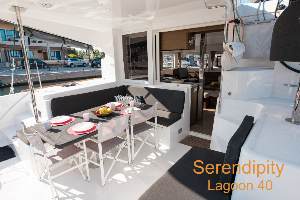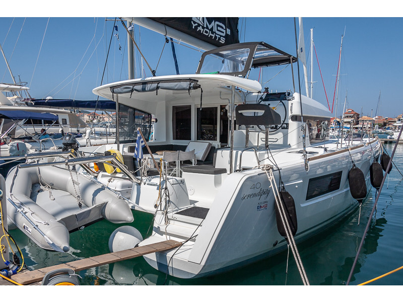 Katamaran Lagoon 40 Serendipity, Baujahr 2018, liegt im Athens, Alimos marina, Peloponnes, Griechenland vor Anker. Es verfügt über 4 + 2 Kabinen und bietet Platz für 8 + 2 + 2 Personen mit 4 + 1 Toiletten. Bettwäsche und Küchenausstattung sind im Preis inbegriffen.