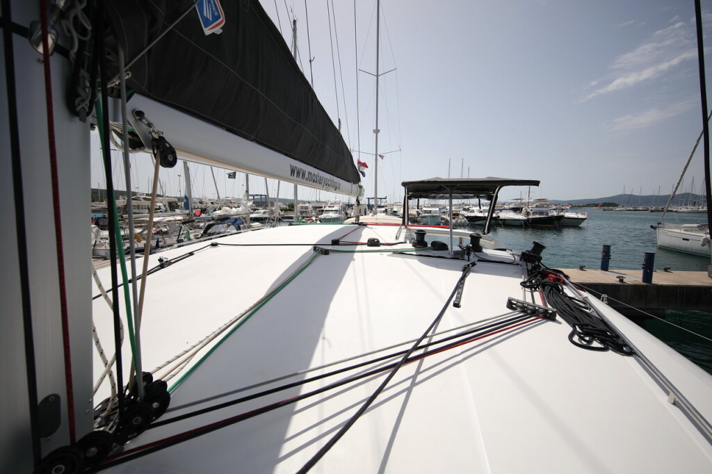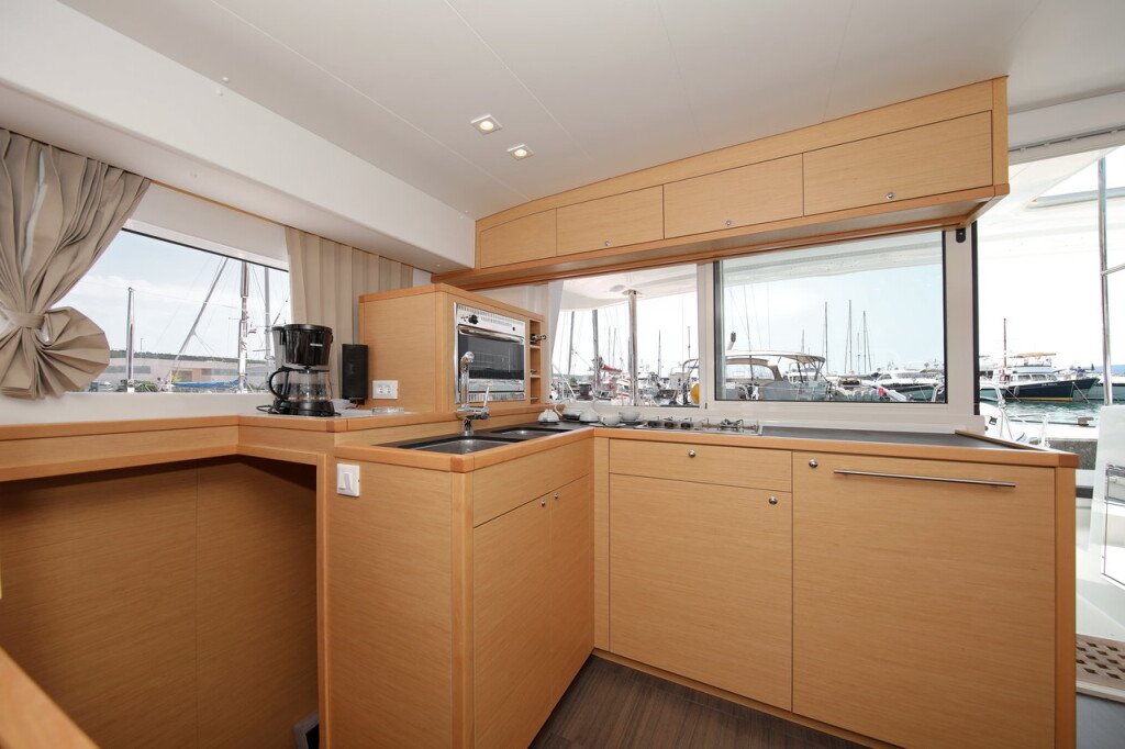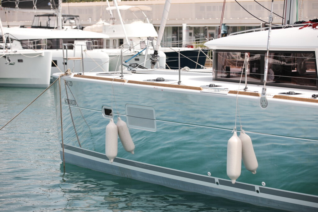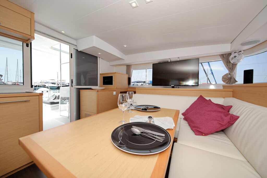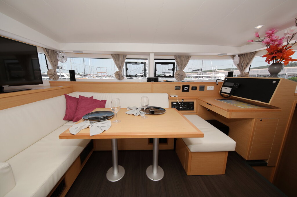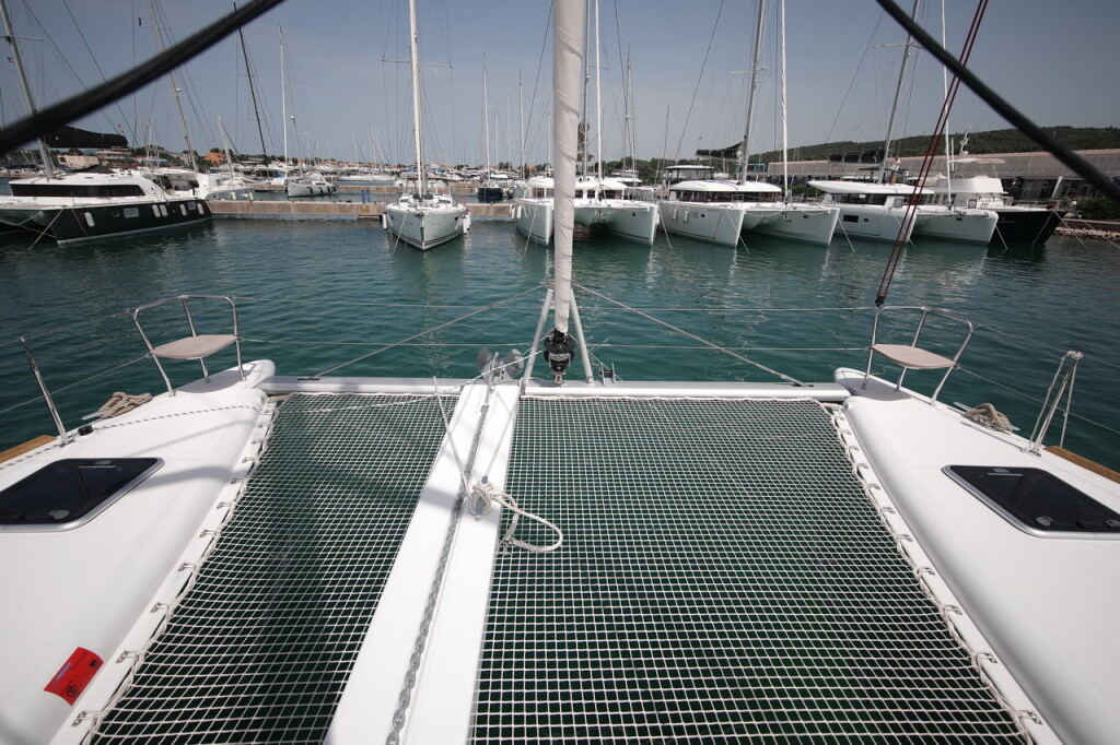 Katamaran Lagoon 400 S2 Scirocco, Baujahr 2018, liegt im Sukosan, D-Marin Dalmacija Marina, Zadar & Umgebung, Kroatien vor Anker. Es verfügt über 4 + 2 Kabinen und bietet Platz für 8 + 2 + 2 Personen mit 4 Toiletten. Bettwäsche und Küchenausstattung sind im Preis inbegriffen.