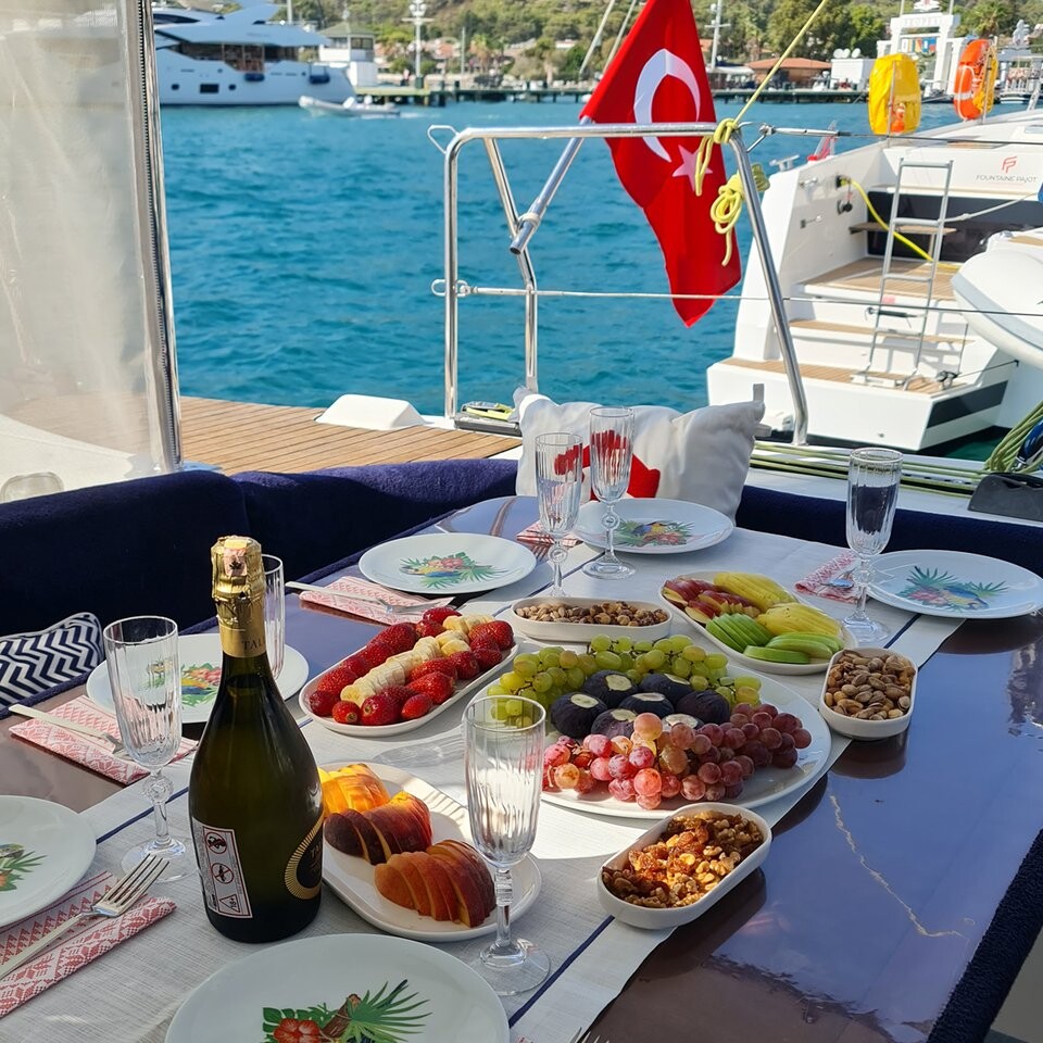 Katamaran Lagoon 410 S2 Aloha, Baujahr 2005, liegt im Fethiye, Yacht Club Mai, Aegean, Türkei vor Anker. Es verfügt über 4 + 1 Kabinen und bietet Platz für 8 Personen mit 4 Toiletten. Bettwäsche und Küchenausstattung sind im Preis inbegriffen.