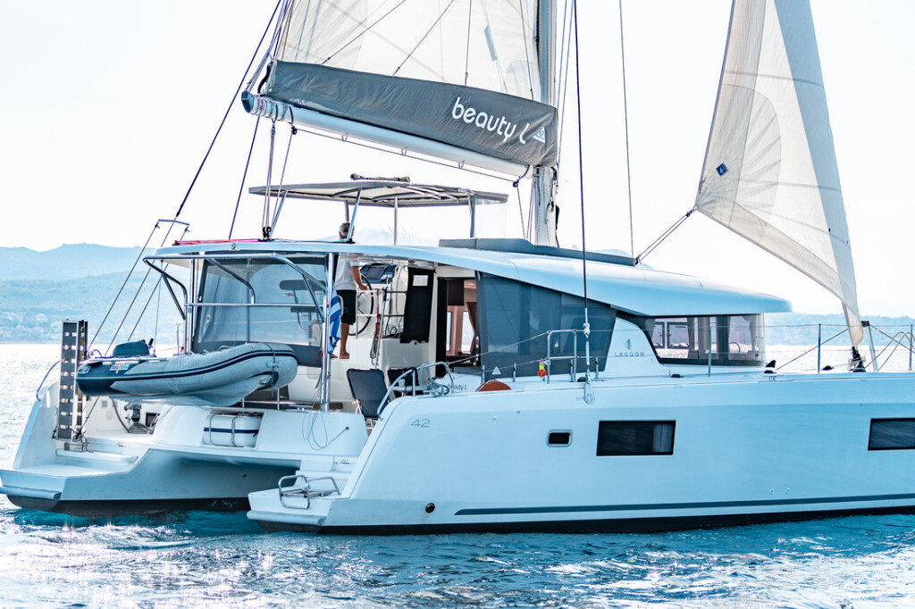 Katamaran Lagoon 42 Beauty L, Baujahr 2018, liegt im Athens, Alimos marina, Peloponnes, Griechenland vor Anker. Es verfügt über 4 + 2 Kabinen und bietet Platz für 8 + 2 + 2 Personen mit 4 + 1 Toiletten. Bettwäsche und Küchenausstattung sind im Preis inbegriffen.
