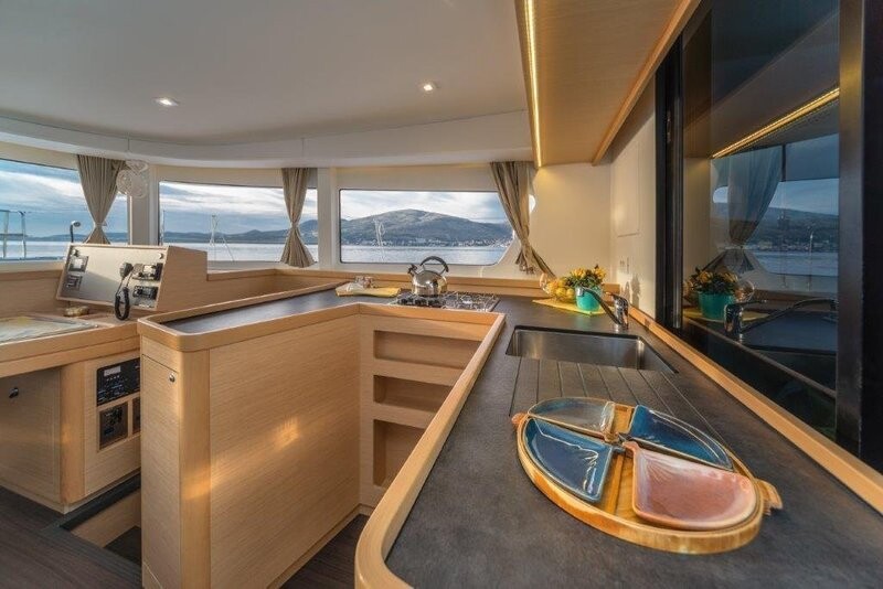 Katamaran Lagoon 42 OW Alina, Baujahr 2023, liegt im Marina, Luka Marina (in der Nähe von Trogir), Split & Umgebung, Kroatien vor Anker. Es verfügt über 3 + 2 Kabinen und bietet Platz für 6 + 2 + 2 Personen mit 3 Toiletten. Bettwäsche und Küchenausstattung sind im Preis inbegriffen.