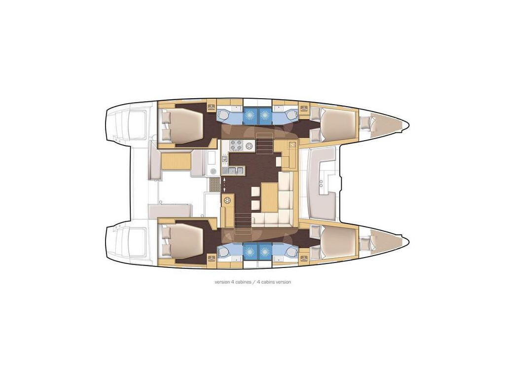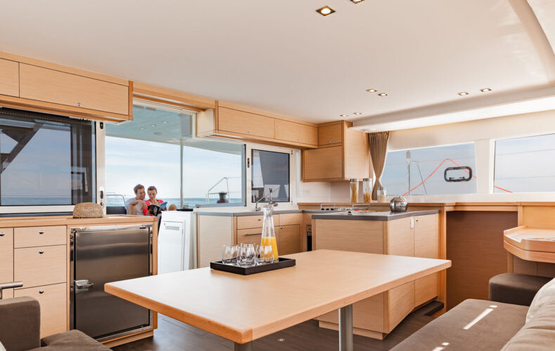 Katamaran Lagoon 450 F BigElli, Baujahr 2019, liegt im Palma de Mallorca, La Lonja, Balearische Inseln, Spanien vor Anker. Es verfügt über 4 + 1 Kabinen und bietet Platz für 8 + 2 + 1 Personen mit 5 Toiletten. Bettwäsche und Küchenausstattung sind im Preis inbegriffen.