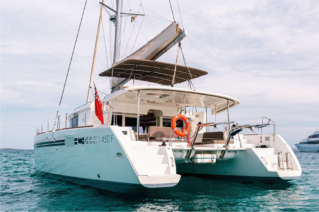 Katamaran Lagoon 450 F Lluna, Baujahr 2017, liegt im Ibiza, Club Nàutic Sant Antoni de Portmany, Balearische Inseln, Spanien vor Anker. Es verfügt über 4 + 1 Kabinen und bietet Platz für 8 + 2 + 1 Personen mit 4 + 1 Toiletten. Bettwäsche und Küchenausstattung sind im Preis inbegriffen.