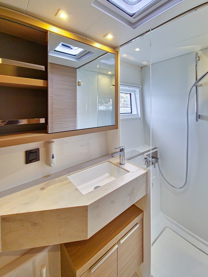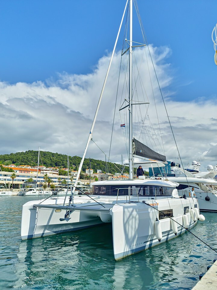 Katamaran Lagoon 46 Felicita, Baujahr 2023, liegt im ACI Marina Split, Split & Umgebung, Kroatien vor Anker. Es verfügt über 4 + 2 Kabinen und bietet Platz für 8 + 2 + 2 Personen mit 4 Toiletten. Bettwäsche und Küchenausstattung sind im Preis inbegriffen.