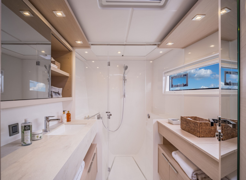 Katamaran Lagoon 46 MARYLOU, Baujahr 2022, liegt im Nassau, Palm Cay Marina, New Providence, Bahamas vor Anker. Es verfügt über 4 + 1 Kabinen und bietet Platz für 9 + 2 Personen mit 4 Toiletten. Bettwäsche und Küchenausstattung sind im Preis inbegriffen.