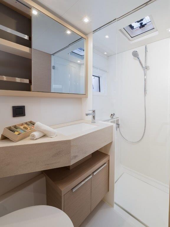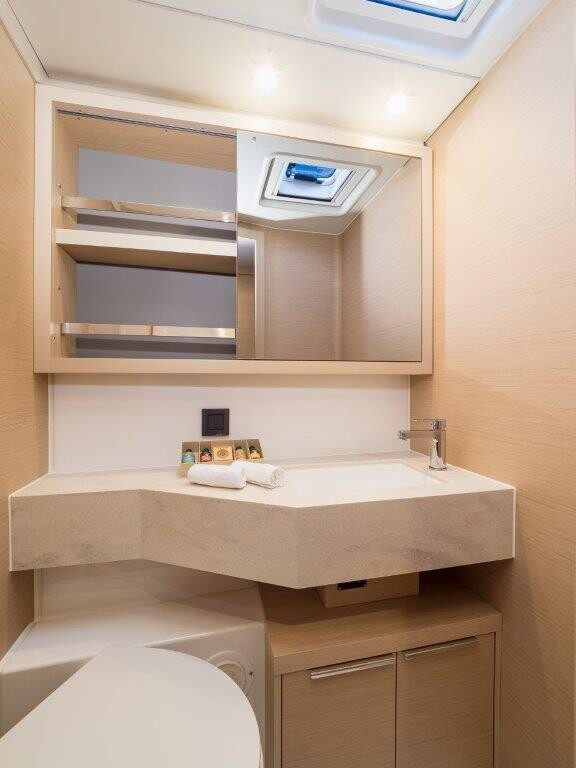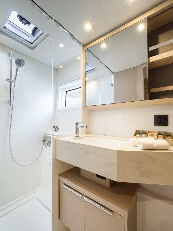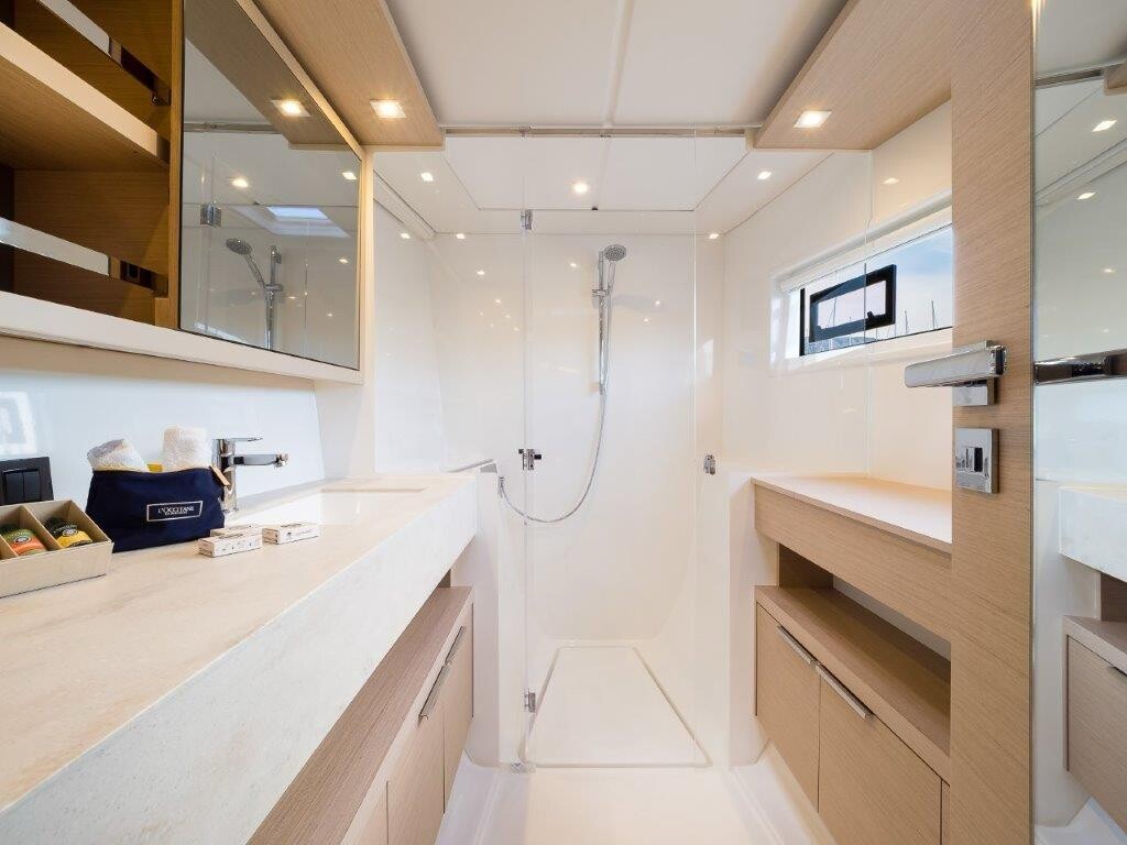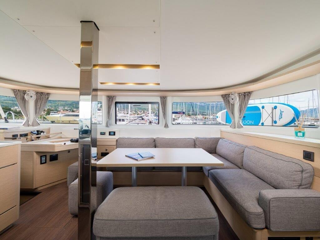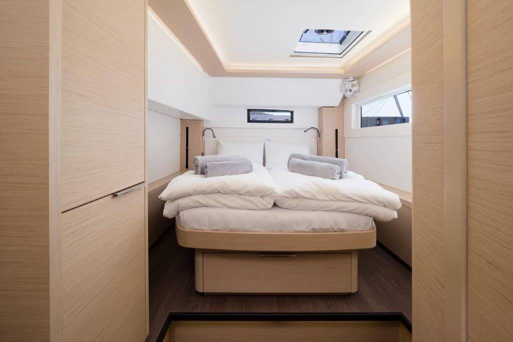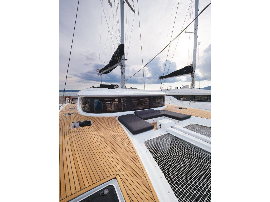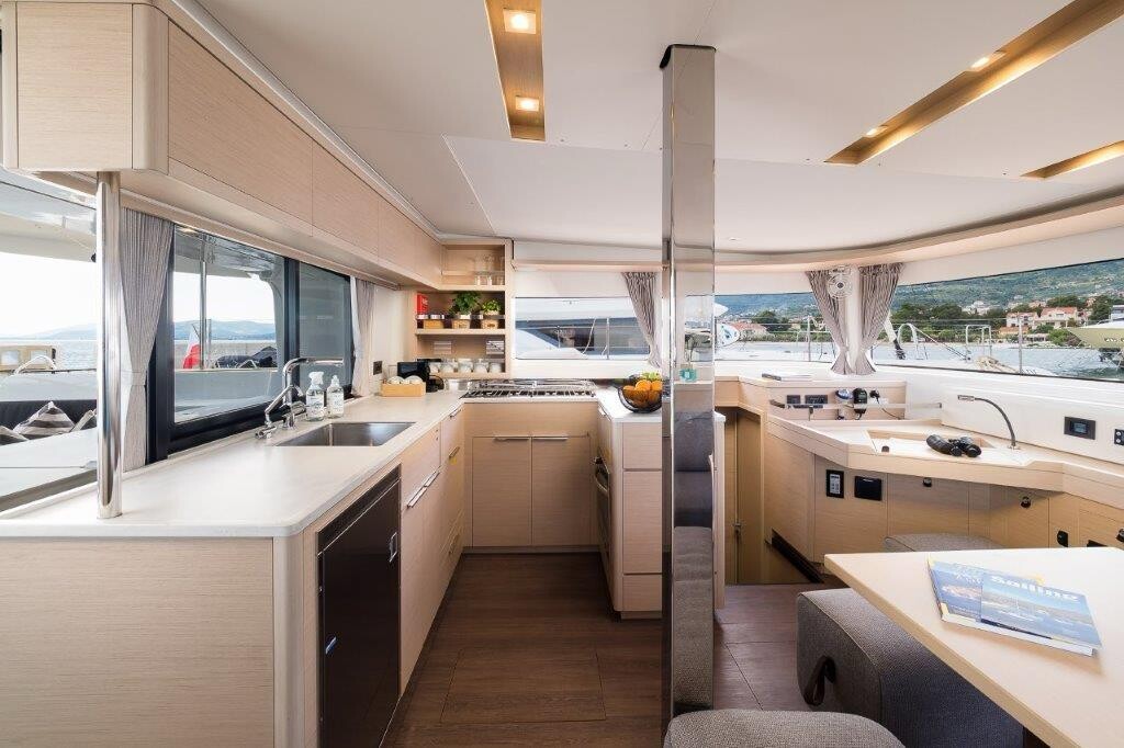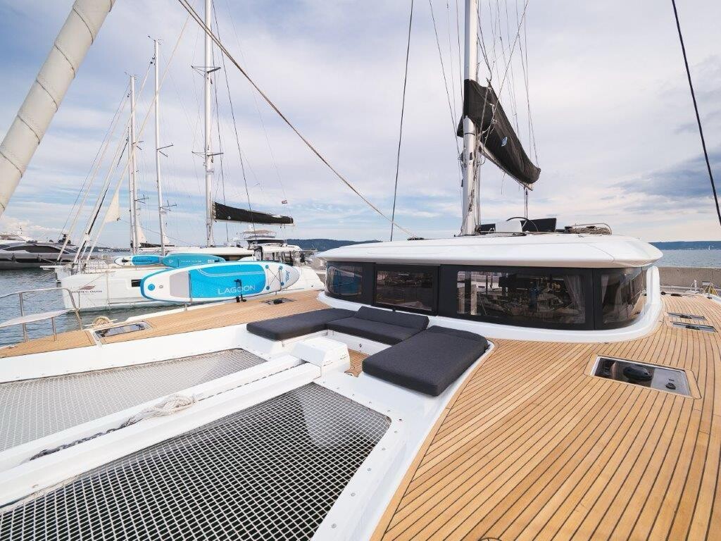Katamaran Lagoon 46 OW Uncharted, Baujahr 2023, liegt im Marina Kastela, Split & Umgebung, Kroatien vor Anker. Es verfügt über 3 + 2 Kabinen und bietet Platz für 6 + 2 Personen mit 3 Toiletten. Bettwäsche und Küchenausstattung sind im Preis inbegriffen.