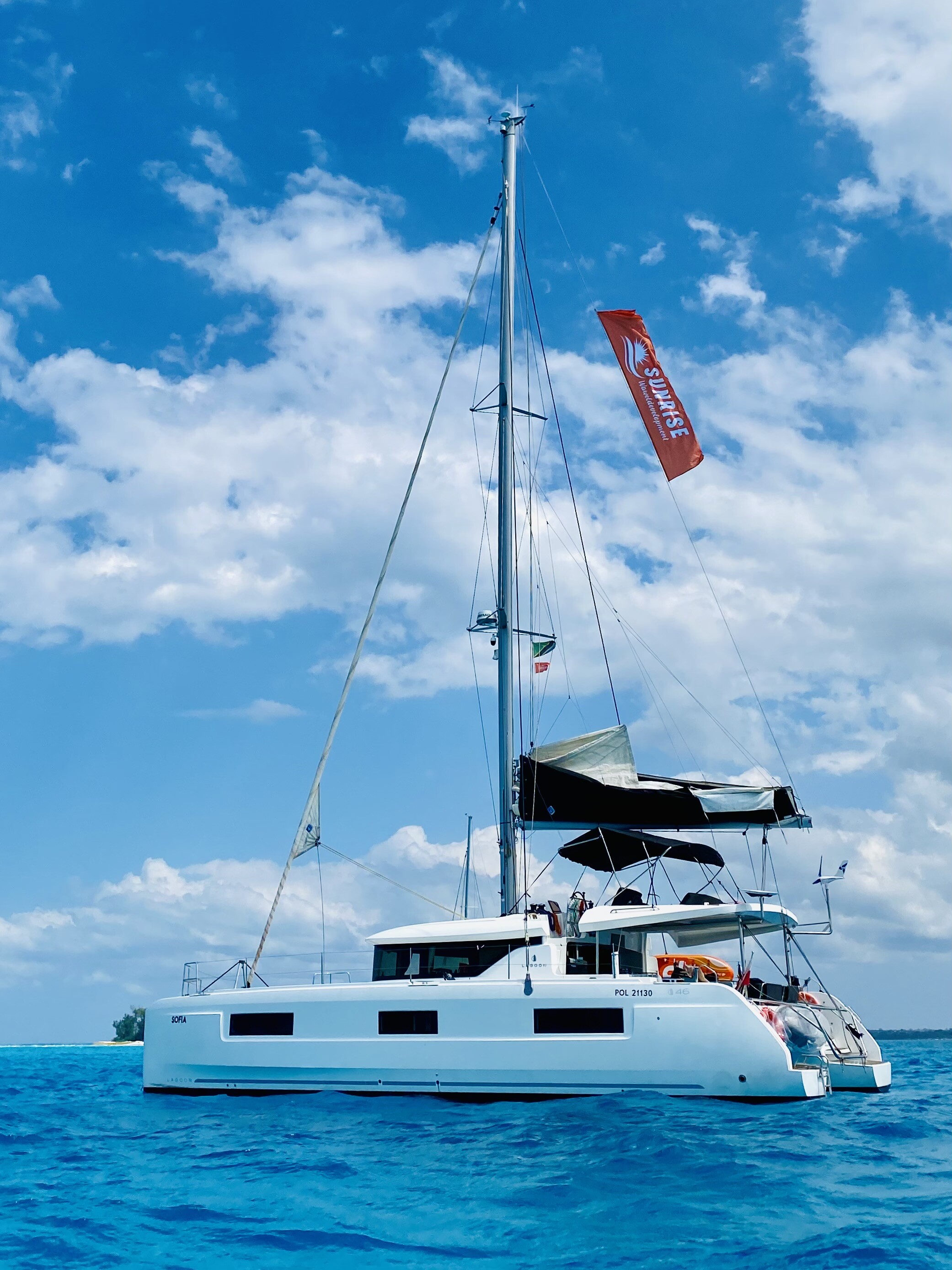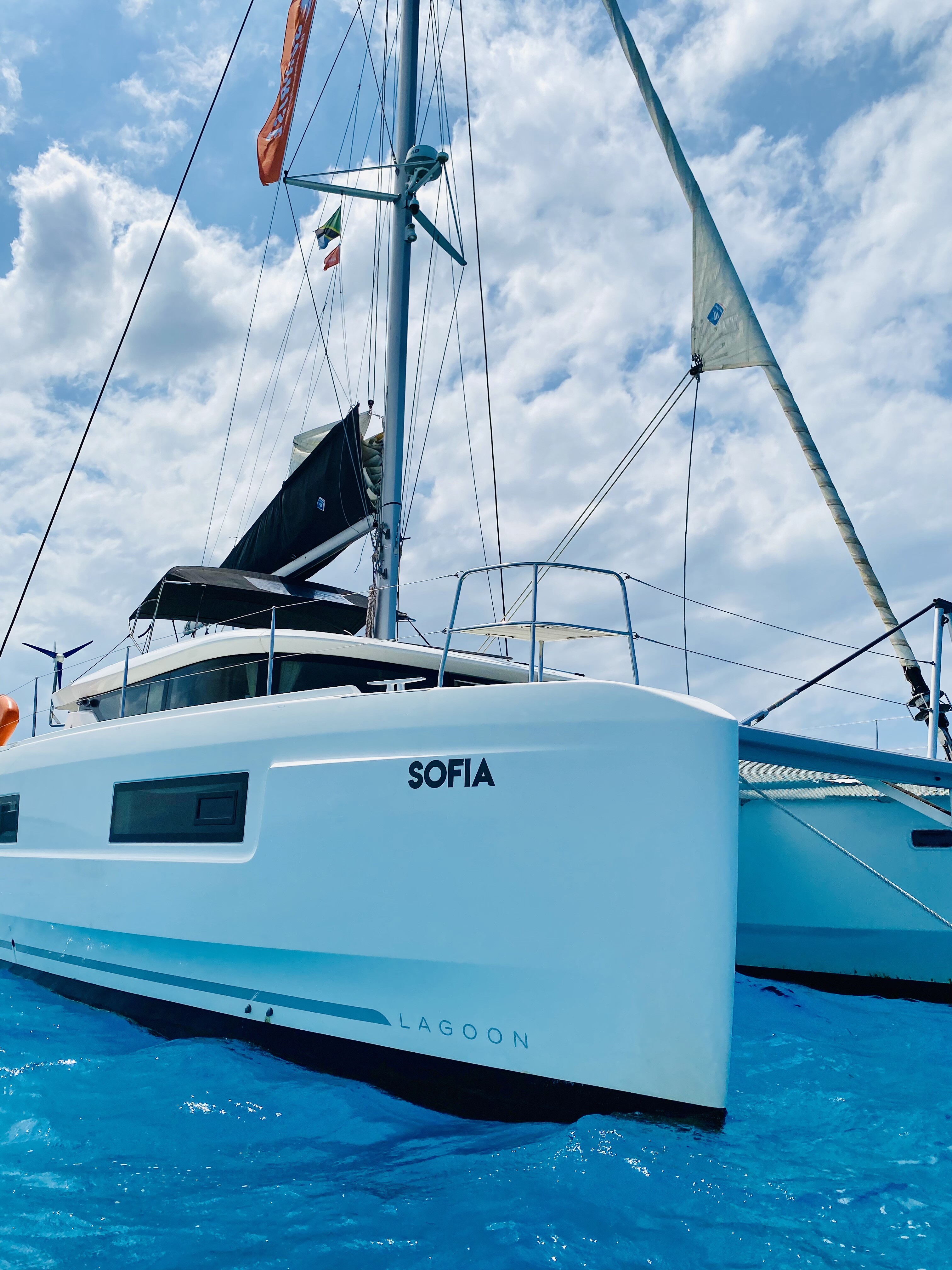 Katamaran Lagoon 46 Sofia, Baujahr 2019, liegt im Zanzibar, Azam Marine, Zanzibar, Tanzania vor Anker. Es verfügt über 3 + 1 Kabinen und bietet Platz für 6 + 1 + 2 Personen mit 4 Toiletten. Bettwäsche und Küchenausstattung sind im Preis inbegriffen.