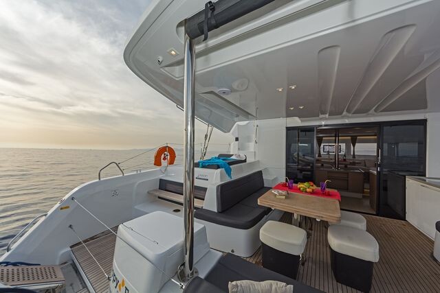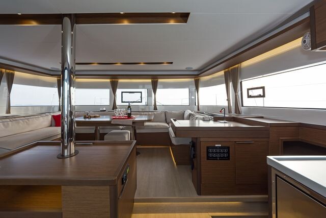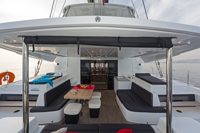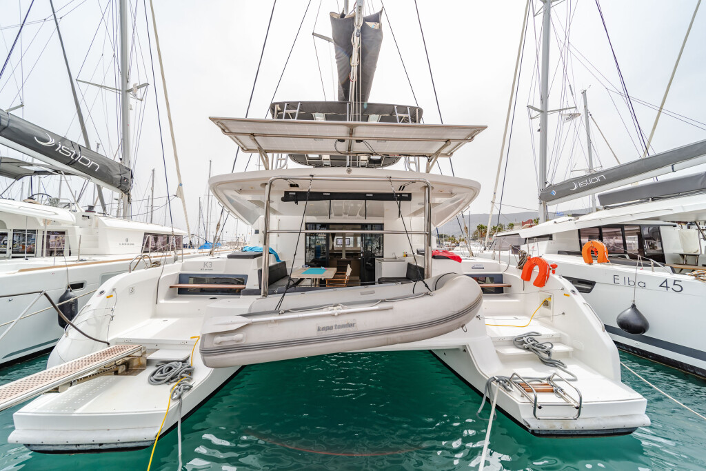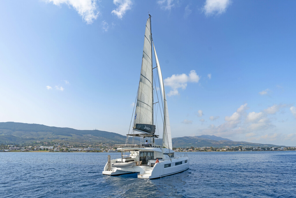 Katamaran Lagoon 50 K3, Baujahr 2019, liegt im Kos, Kos Marina, Dodekanes, Griechenland vor Anker. Es verfügt über 6 + 2 Kabinen und bietet Platz für 12 + 2 Personen mit 4 + 1 Toiletten. Bettwäsche und Küchenausstattung sind im Preis inbegriffen.