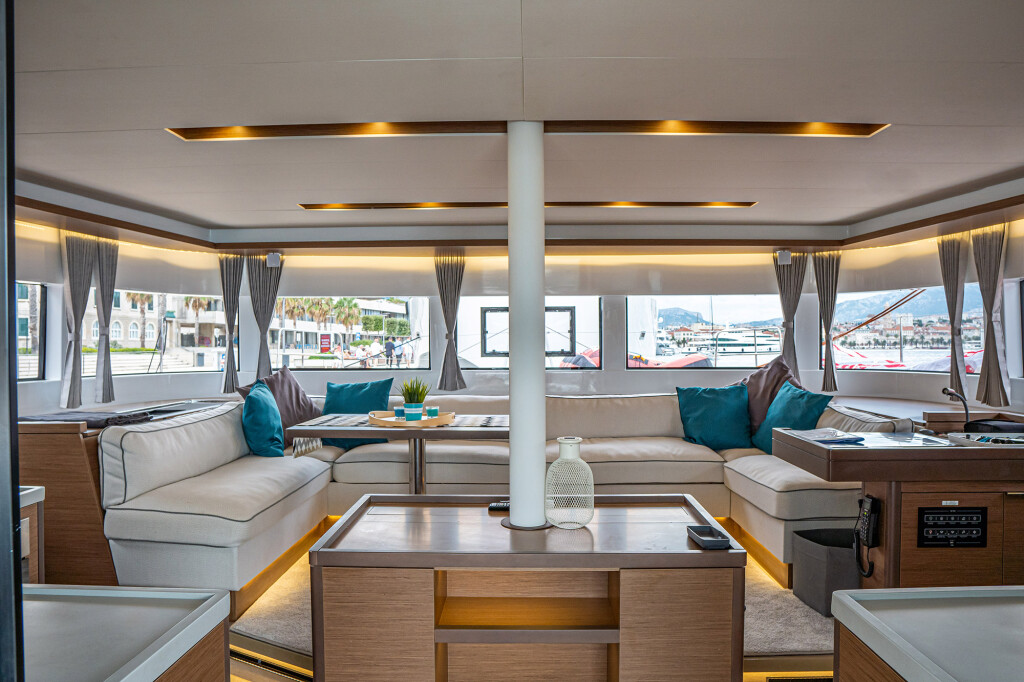 Katamaran Lagoon 50 Princess Kiss, Baujahr 2020, liegt im Marina Kastela, Split & Umgebung, Kroatien vor Anker. Es verfügt über 5 + 2 Kabinen und bietet Platz für 10 + 2 Personen mit 4 Toiletten. Bettwäsche und Küchenausstattung sind im Preis inbegriffen.