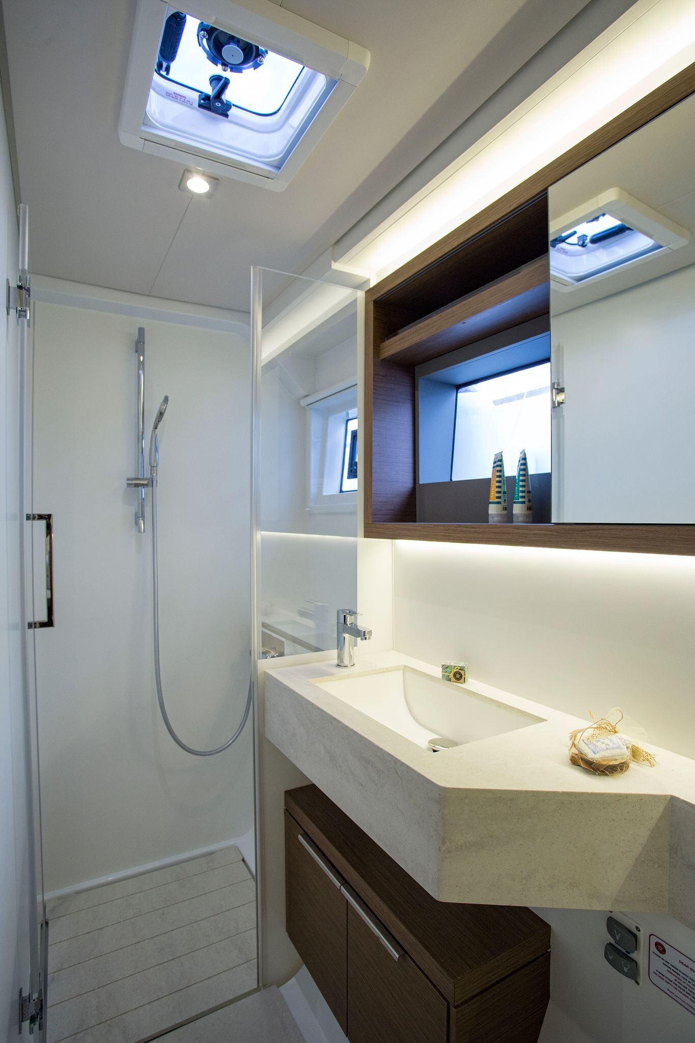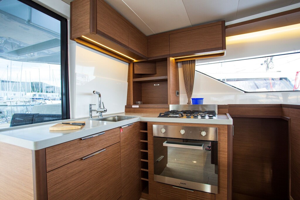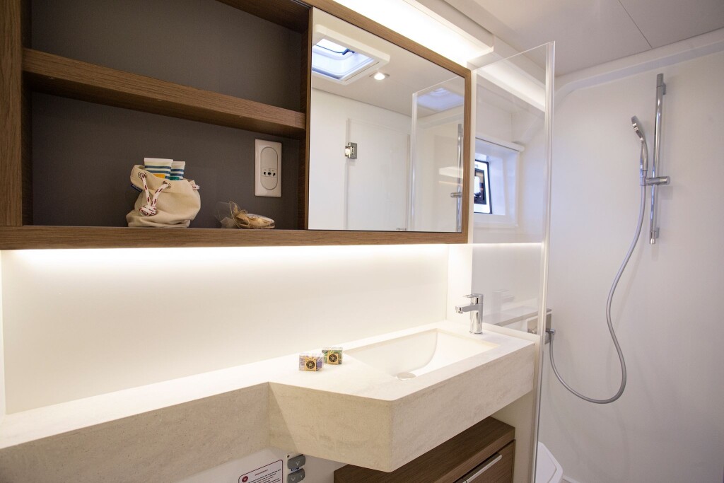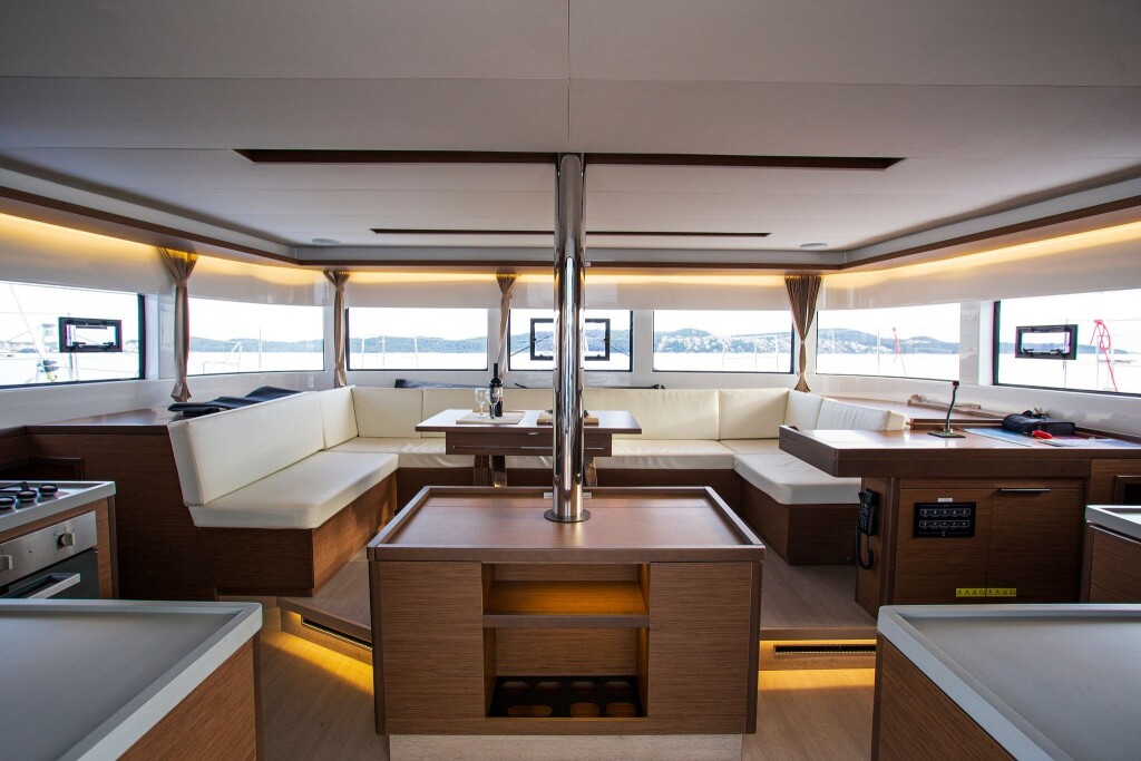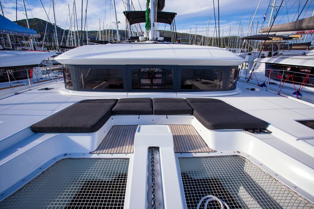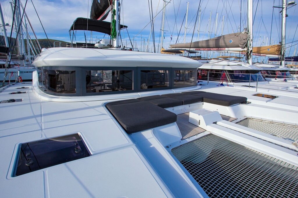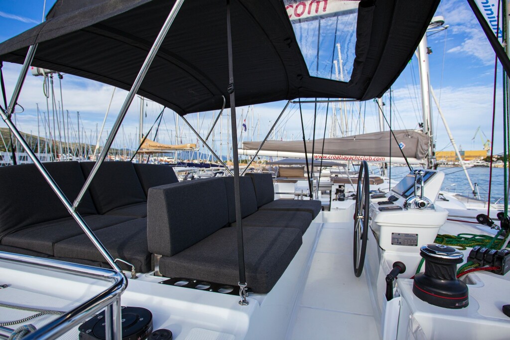 Katamaran Lagoon 50 Sail La Vie, Baujahr 2018, liegt im Trogir, Yachtclub Seget (Marina Baotić), Split & Umgebung, Kroatien vor Anker. Es verfügt über 4 + 2 Kabinen und bietet Platz für 8 + 2 + 2 Personen mit 4 Toiletten. Bettwäsche und Küchenausstattung sind im Preis inbegriffen.