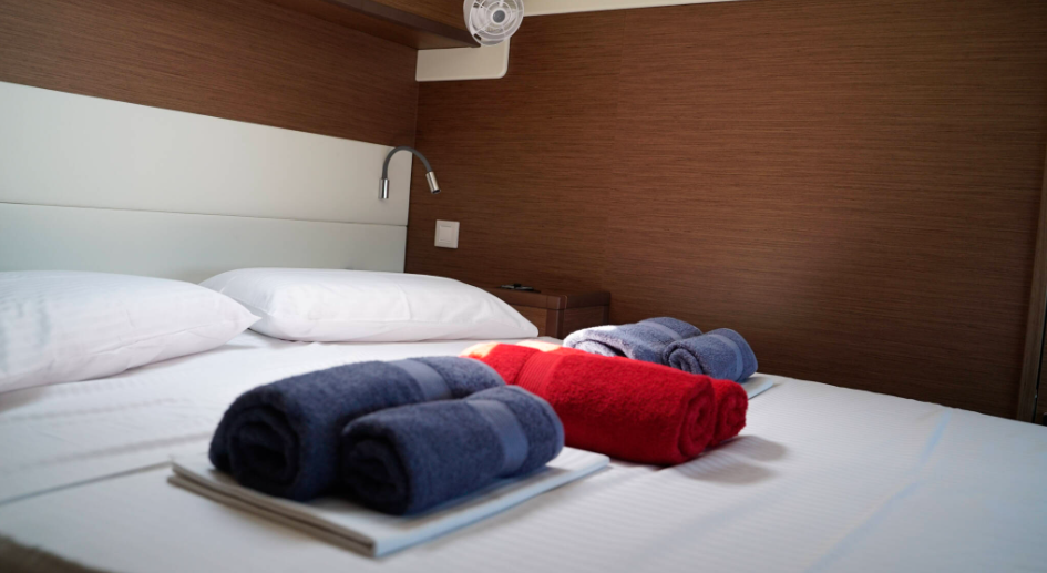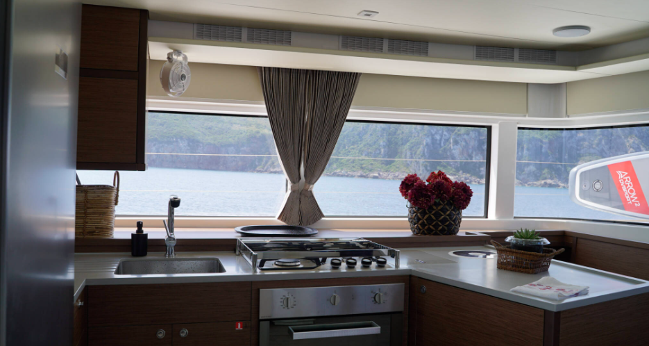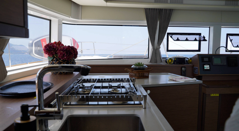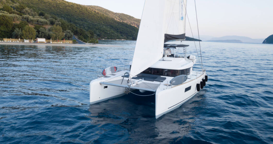Katamaran Lagoon 52 F Blue Velvet, Baujahr 2020, liegt im Lefkas main port, Ionisches Meer, Griechenland vor Anker. Es verfügt über 6 + 2 Kabinen und bietet Platz für 12 + 2 Personen mit 6 + 1 Toiletten. Bettwäsche und Küchenausstattung sind im Preis inbegriffen.