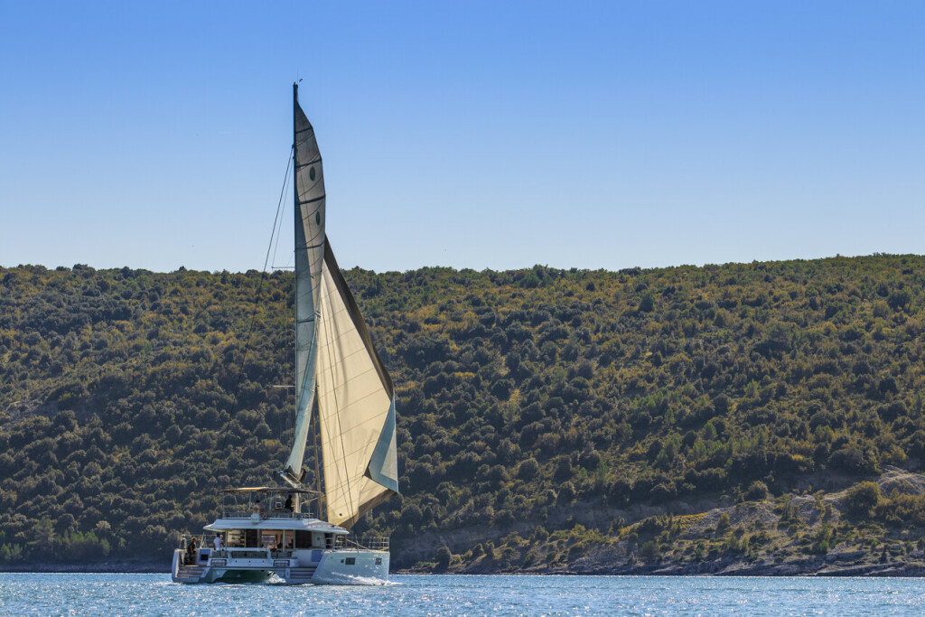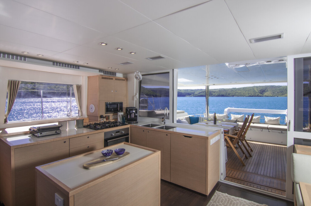 Katamaran Lagoon 560 Cool Change, Baujahr 2015, liegt im Marina, Marina Agana (in der Nähe von Trogir), Split & Umgebung, Kroatien vor Anker. Es verfügt über 4 Kabinen und bietet Platz für 8 Personen mit 5 Toiletten. Bettwäsche und Küchenausstattung sind im Preis inbegriffen.