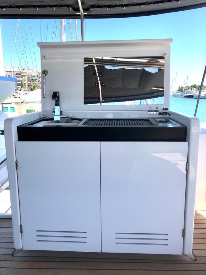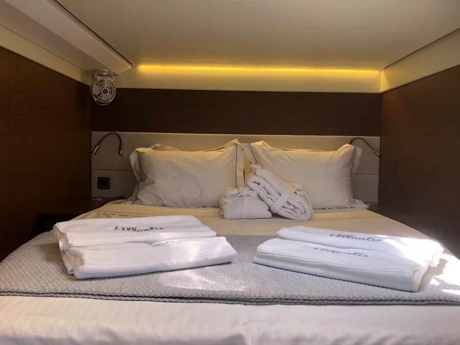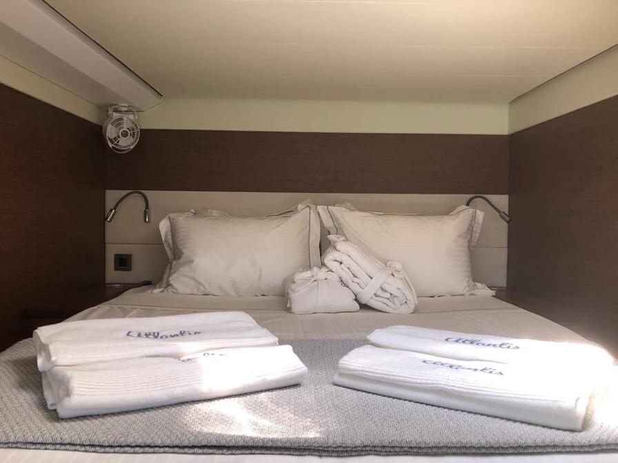 Katamaran Lagoon 620 Atlantis, Baujahr 2020, liegt im Lavrion - Olympic Marine, Peloponnes, Griechenland vor Anker. Es verfügt über 4 + 1 Kabinen und bietet Platz für 8 + 3 Personen mit 4 Toiletten. Bettwäsche und Küchenausstattung sind im Preis inbegriffen.