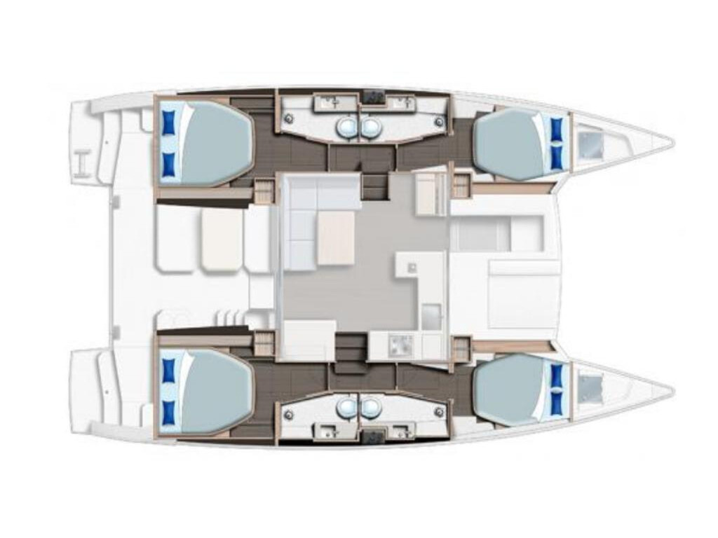 Katamaran Leopard 42 Lilamac, Baujahr 2022, liegt im Sardinien, Cannigione, Sardinien, Italien vor Anker. Es verfügt über 4 Kabinen und bietet Platz für 8 + 2 Personen mit 4 Toiletten. Bettwäsche und Küchenausstattung sind im Preis inbegriffen.