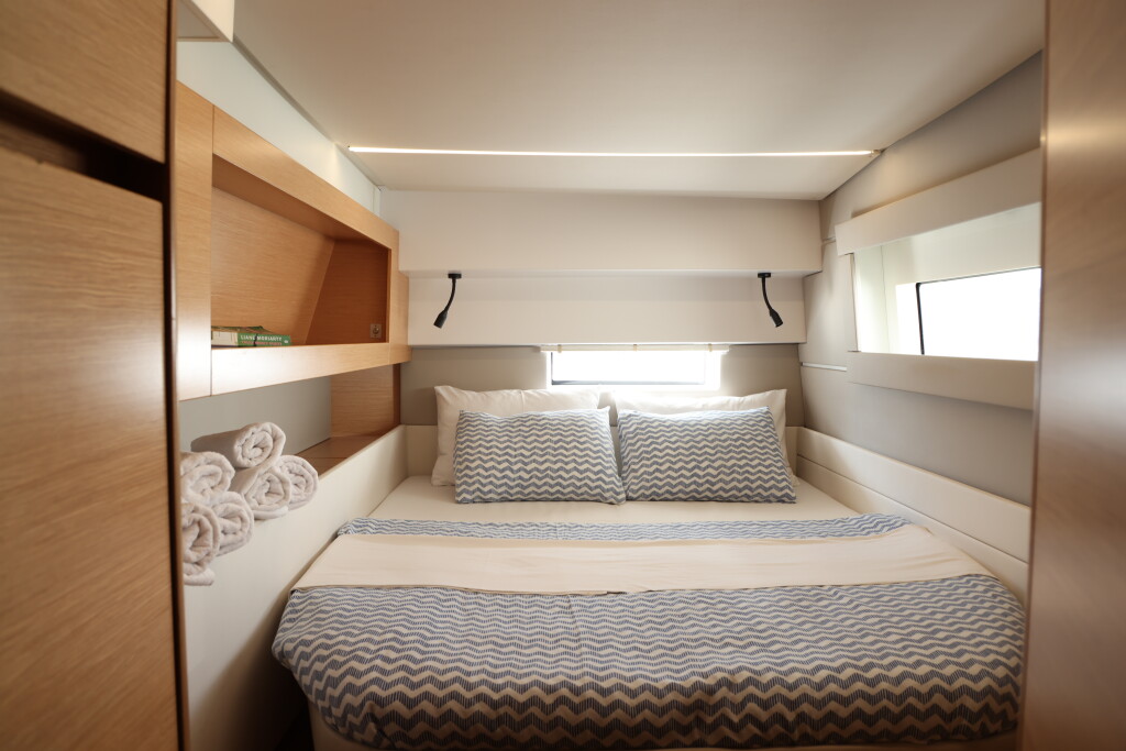 Katamaran Nautitech 46 Sithonia, Baujahr 2019, liegt im Athens, Alimos marina, Peloponnes, Griechenland vor Anker. Es verfügt über 4 + 2 Kabinen und bietet Platz für 8 + 2 Personen mit 4 + 1 Toiletten. Bettwäsche und Küchenausstattung sind im Preis inbegriffen.